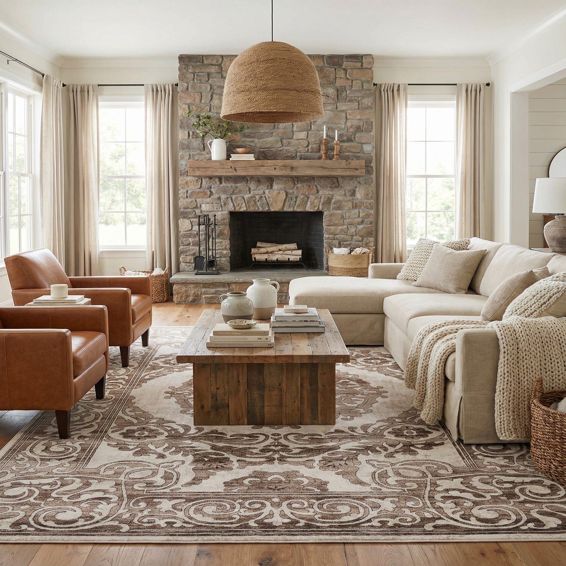 Primary color is Chocolate Brown. Colors in this rug include: Chocolate Brown, Beige, Black.