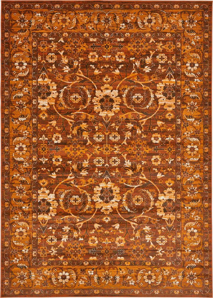 Primary color is Chocolate Brown. Colors in this rug include: Chocolate Brown, Black, Ivory, Orange, Terracotta, Yellow.