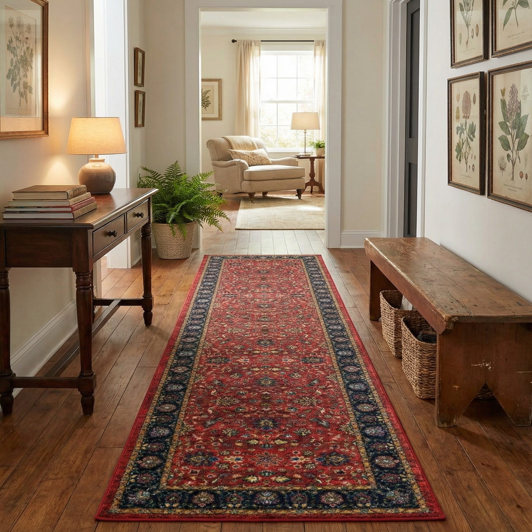 Primary color is Classic Red. Colors in this rug include: Classic Red, Gold, Ivory, Navy Blue, Olive, Pink, Brown, Burgundy.