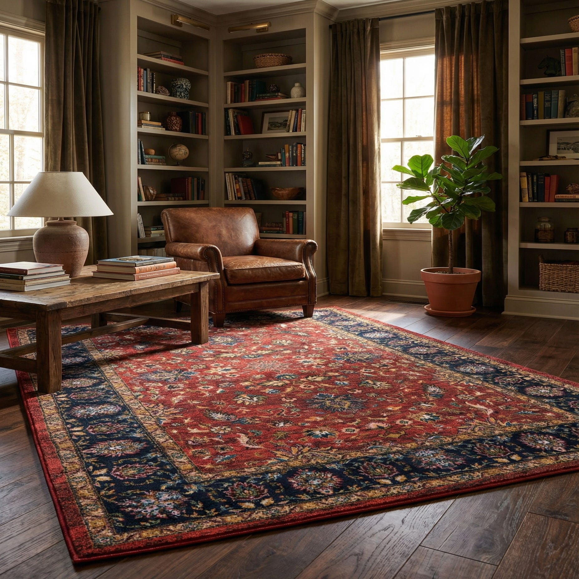 Primary color is Classic Red. Colors in this rug include: Classic Red, Black, Blue, Brown, Beige, Burgundy, Olive, Yellow, Pink.
