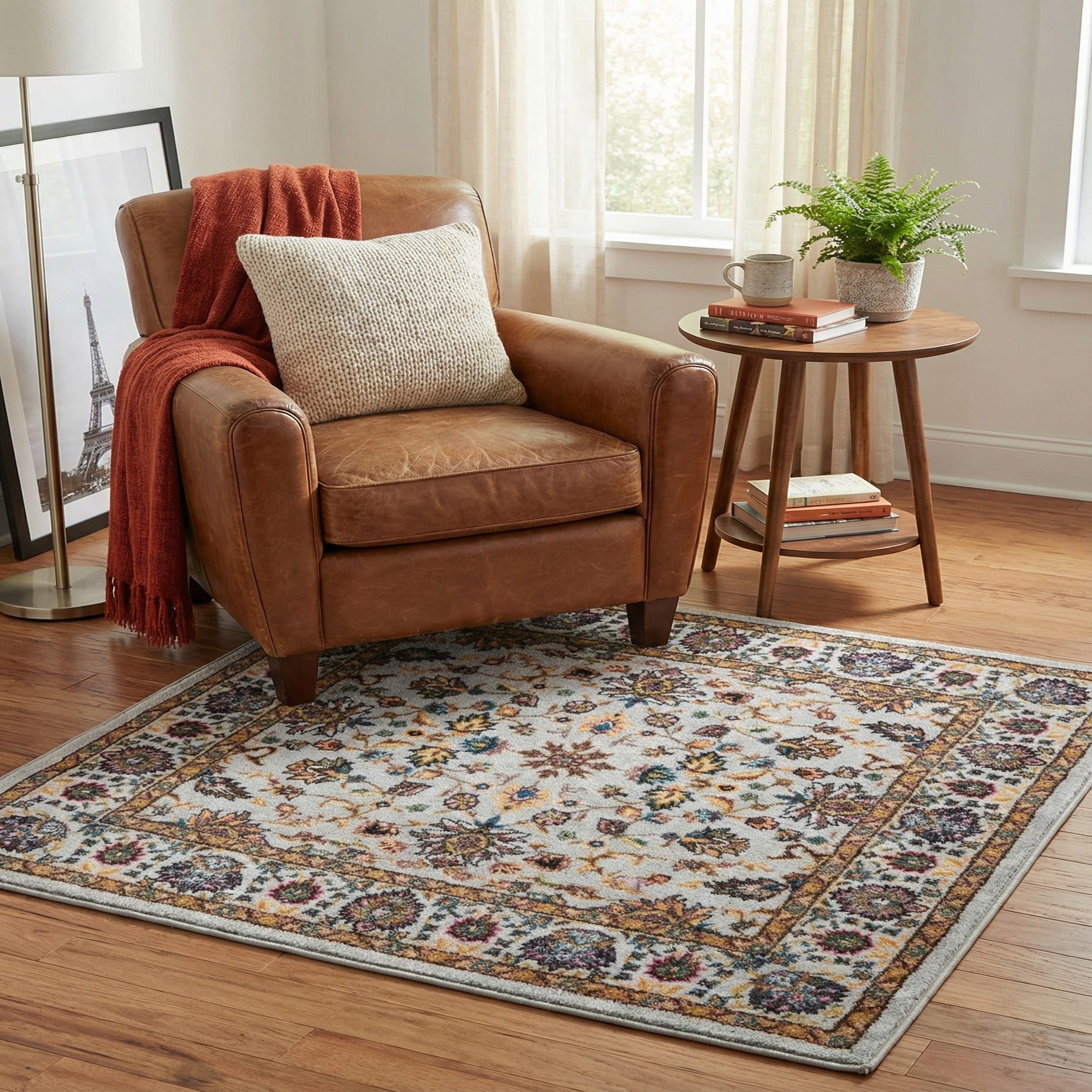 Primary color is Cloud Gray. Colors in this rug include: Cloud Gray, Beige, Black, Blue, Brown, Green, Yellow, Pink.
