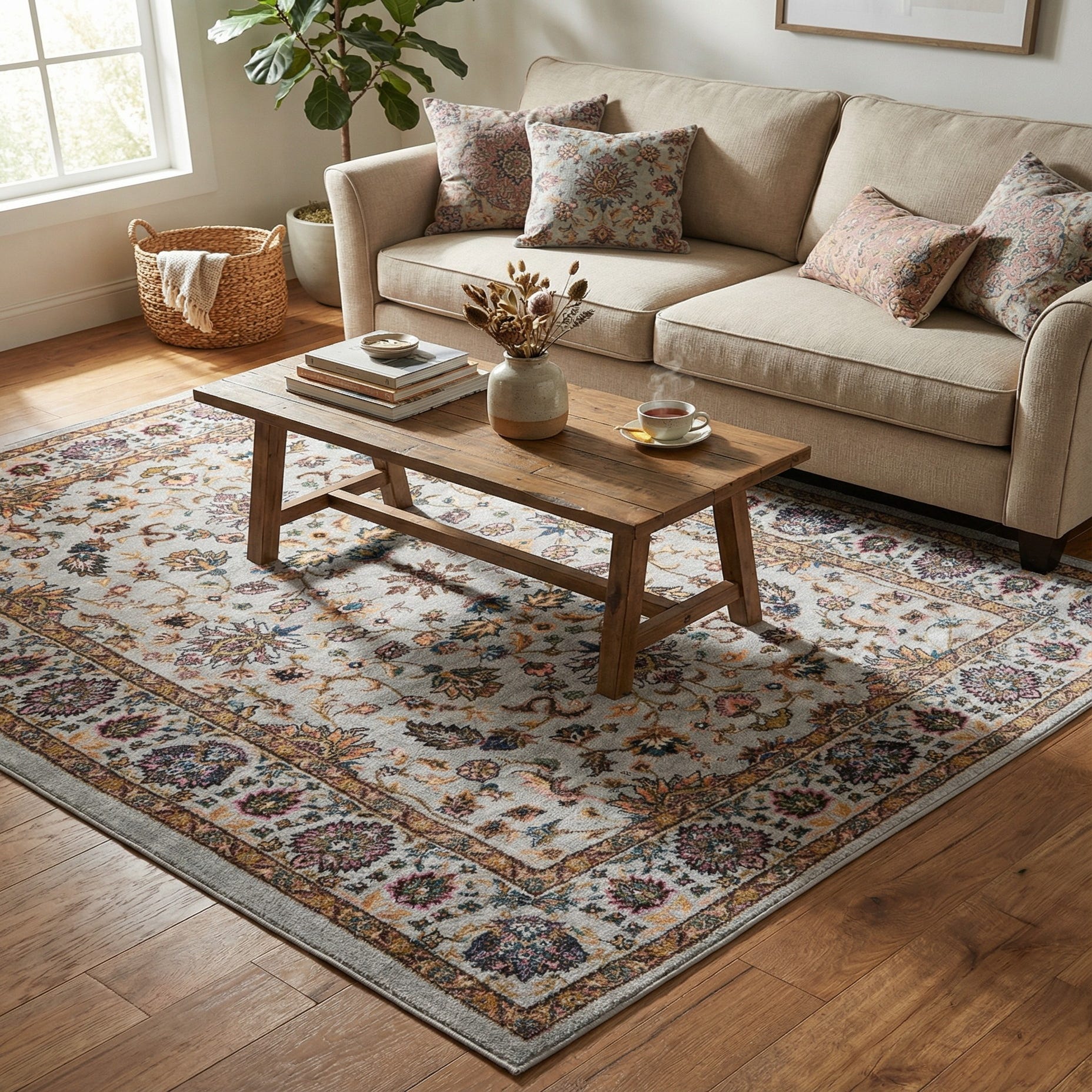 Primary color is Cloud Gray. Colors in this rug include: Cloud Gray, Beige, Black, Blue, Brown, Yellow, Pink, Green.