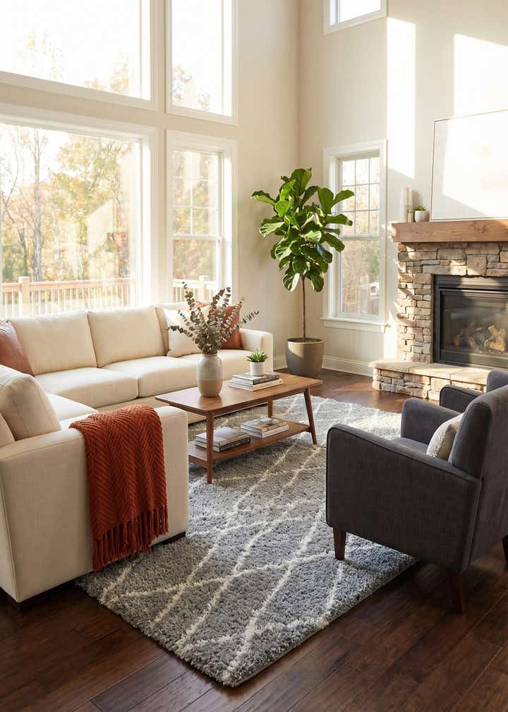 Bought this rug in the largest size for my living room. The turquoise works great with my decor and really tied all the areas together. Nice feeling shag color is not as bright as it appeared.