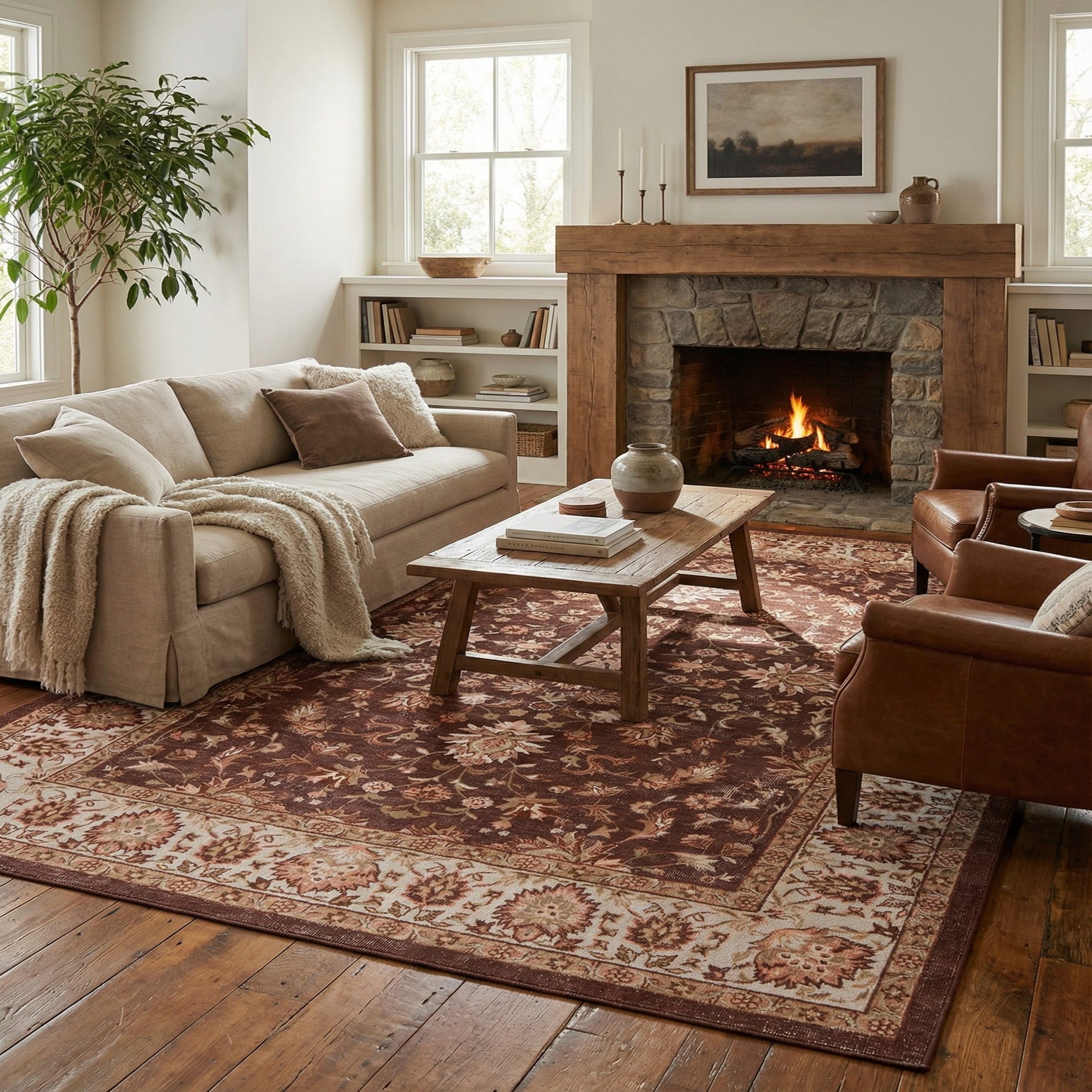Primary color is Coffee Brown. Colors in this rug include: Coffee Brown, Ivory, Orange, Light Brown.