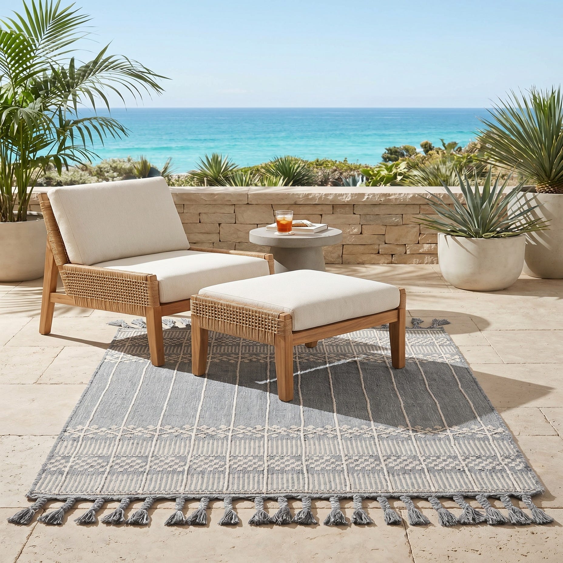 Absolutely love this rug. It doesn’t even seem like I should leave outdoors. It’s soft and comfortable to the touch not scratchy. The pattern is beautiful. We are extremely pleased.