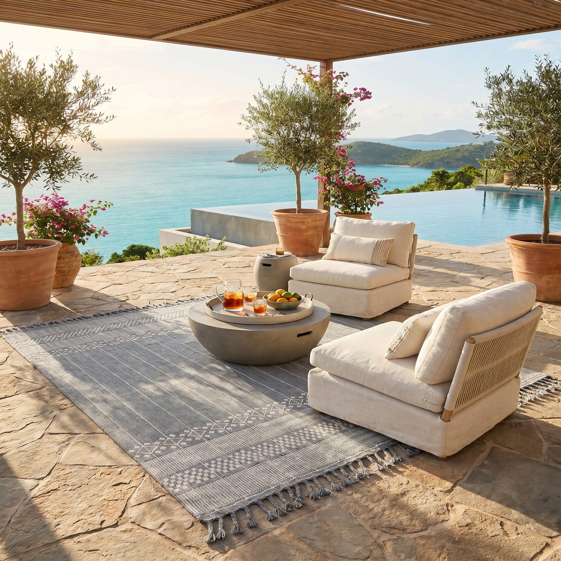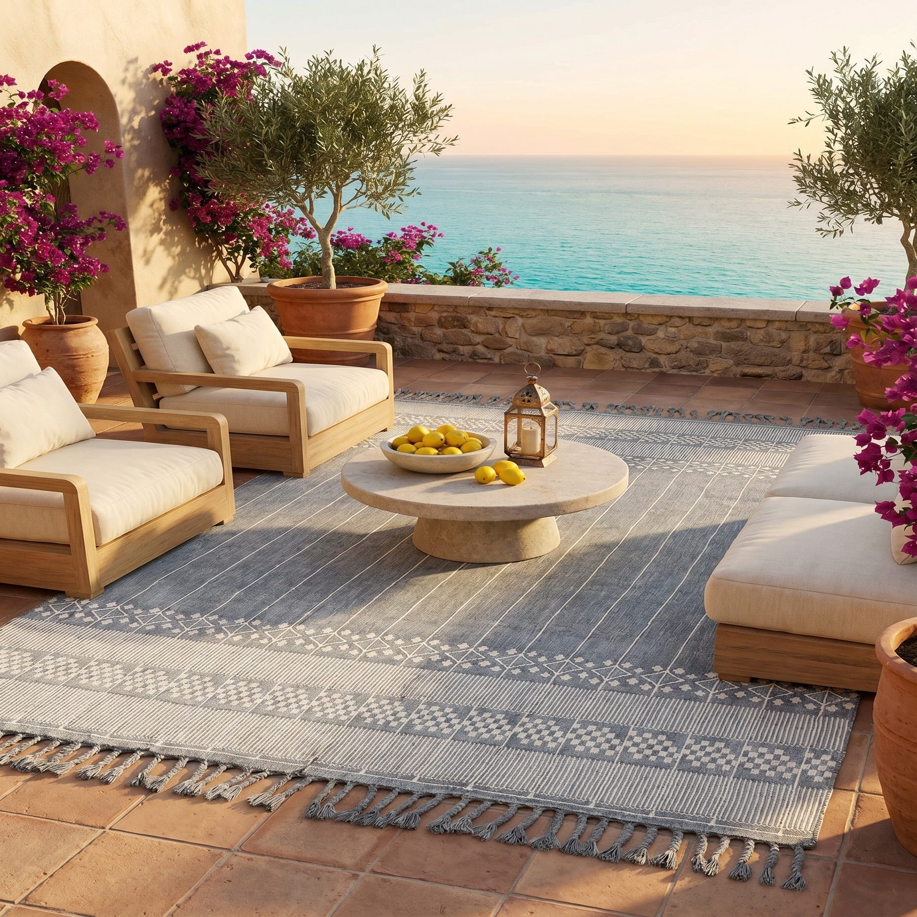 Absolutely love this rug. It doesn’t even seem like I should leave outdoors. It’s soft and comfortable to the touch not scratchy. The pattern is beautiful. We are extremely pleased.