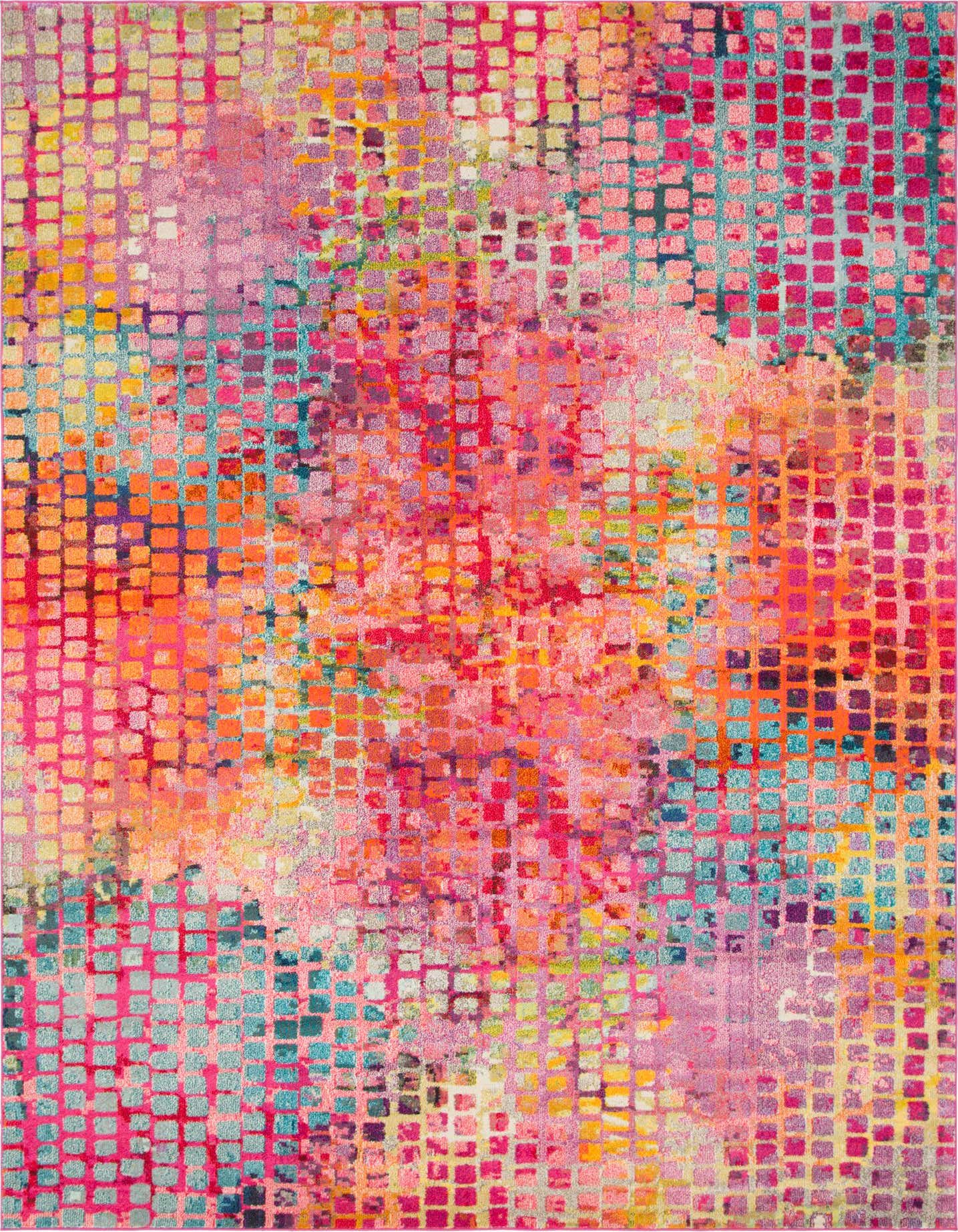 Primary color is Cotton Candy. Colors in this rug include: Cotton Candy, Blue, Green, Ivory, Navy Blue, Olive, Orange, Yellow.