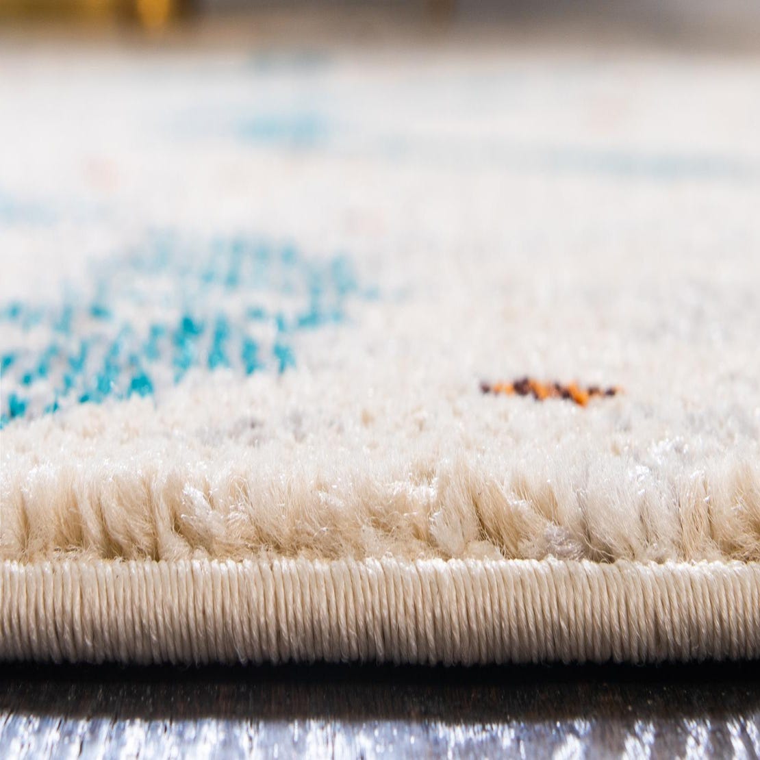 Primary color is Cream. Colors in this rug include: Cream, Blue, Ivory, Orange, Brown.