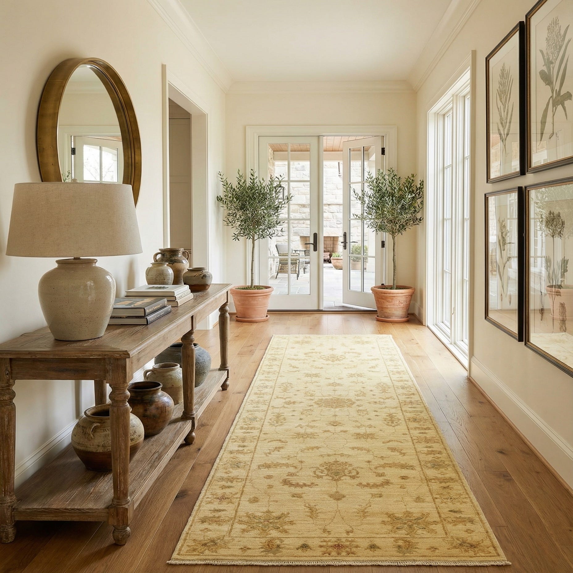 Primary color is Cream. Colors in this rug include: Cream, Gold, Olive, Brown.