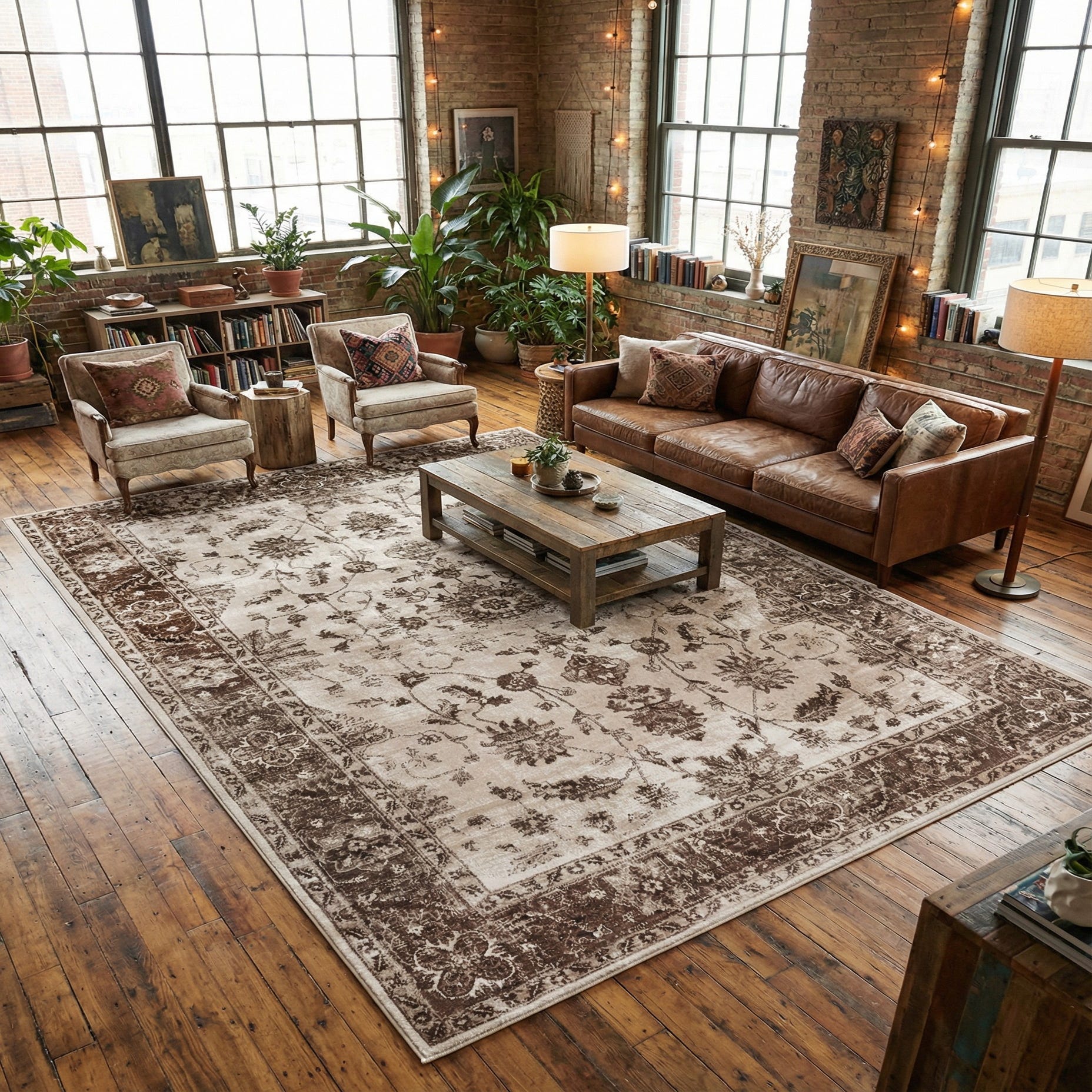Primary color is Cream. Colors in this rug include: Cream, Beige, Brown, Light Brown.