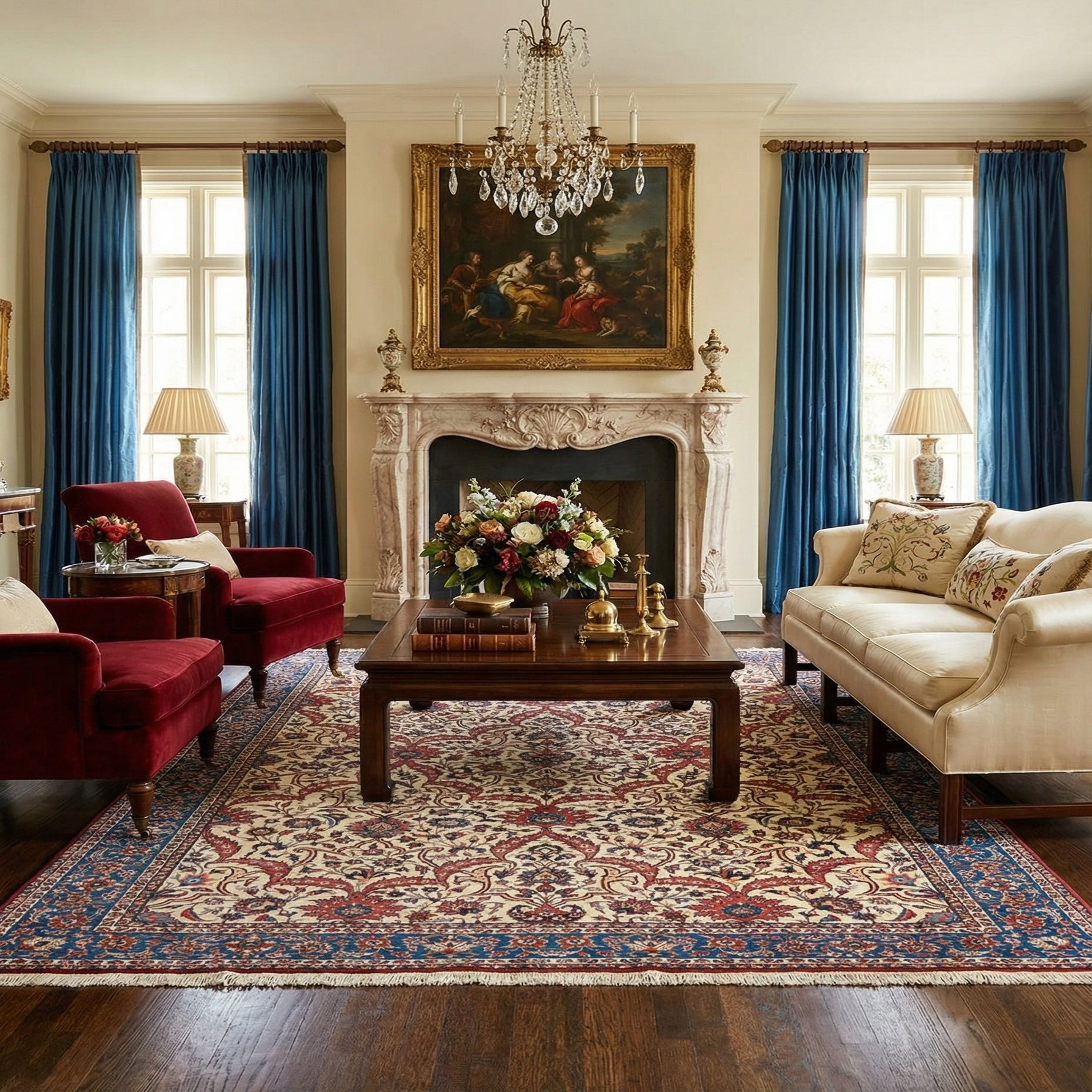 Primary color is Cream. Colors in this rug include: Cream, Cream, Blue, Red, Olive, Orange, Dark Blue, Brown.