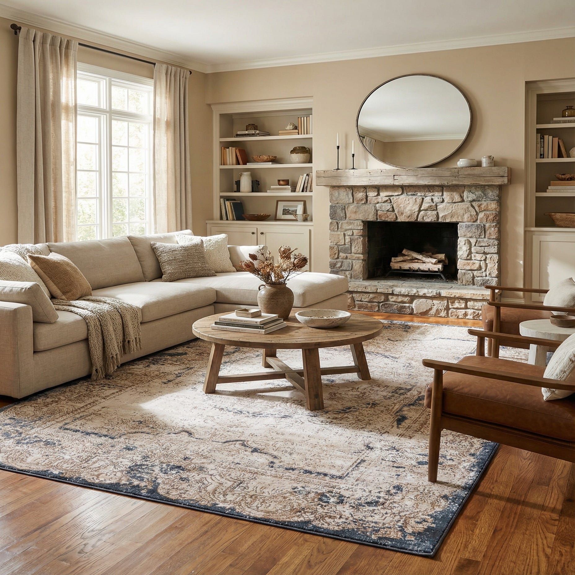 Primary color is Cream. Colors in this rug include: Cream, Beige, Brown, Light Blue.