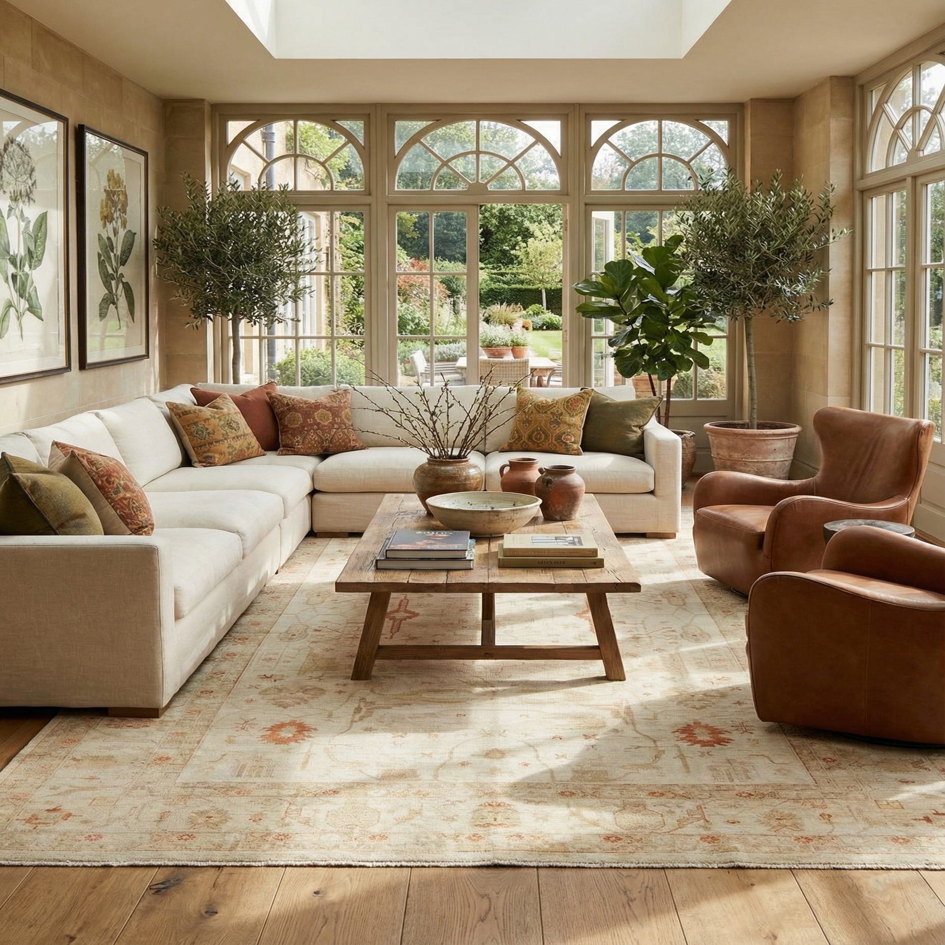 Primary color is Cream. Colors in this rug include: Cream, Brown, Gold.