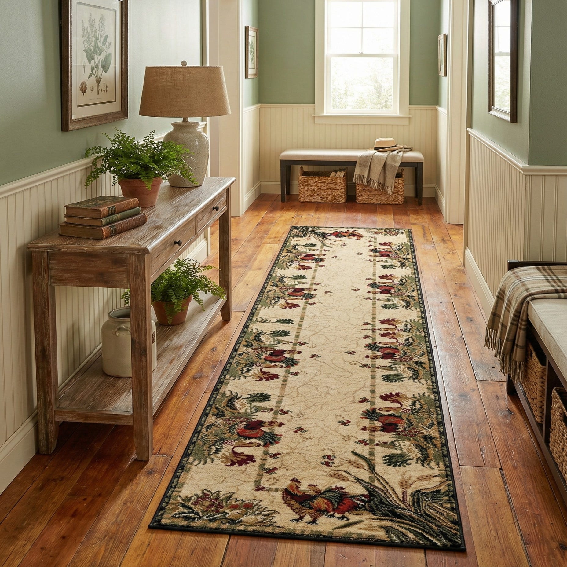 Primary color is Cream. Colors in this rug include: Cream, Black, Green, Light Brown, Olive, Red, Rust Red, Tan.