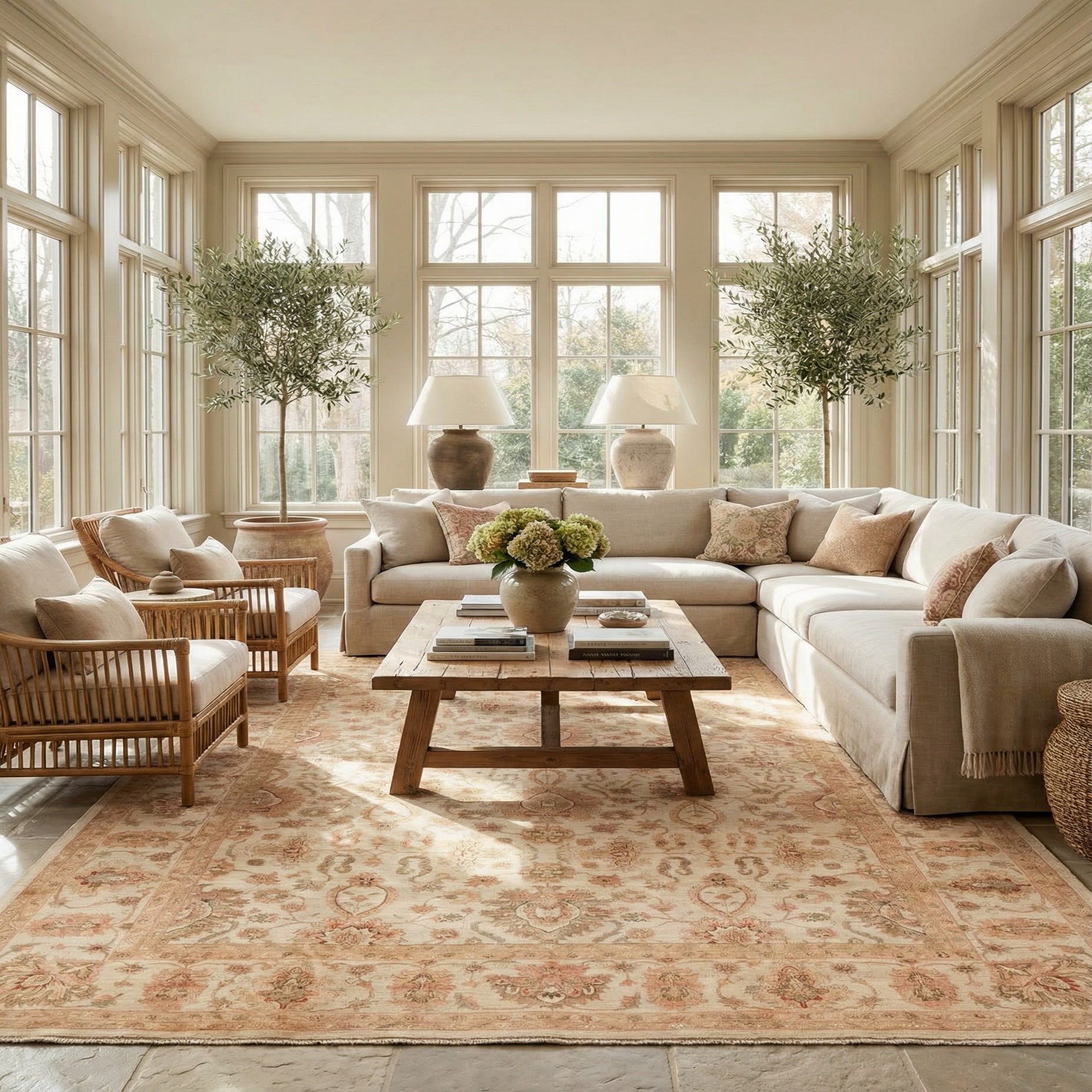 Primary color is Cream. Colors in this rug include: Cream, Beige, Gold, Tan, Salmon, Red, Hunter Green.