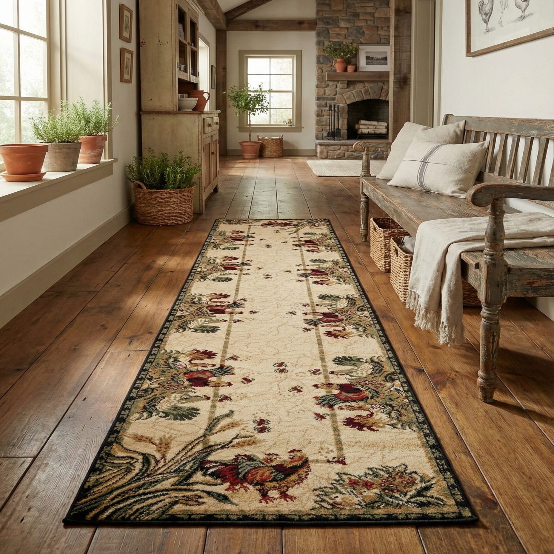 Primary color is Cream. Colors in this rug include: Cream, Black, Green, Light Brown, Red, Rust Red, Tan, Olive.