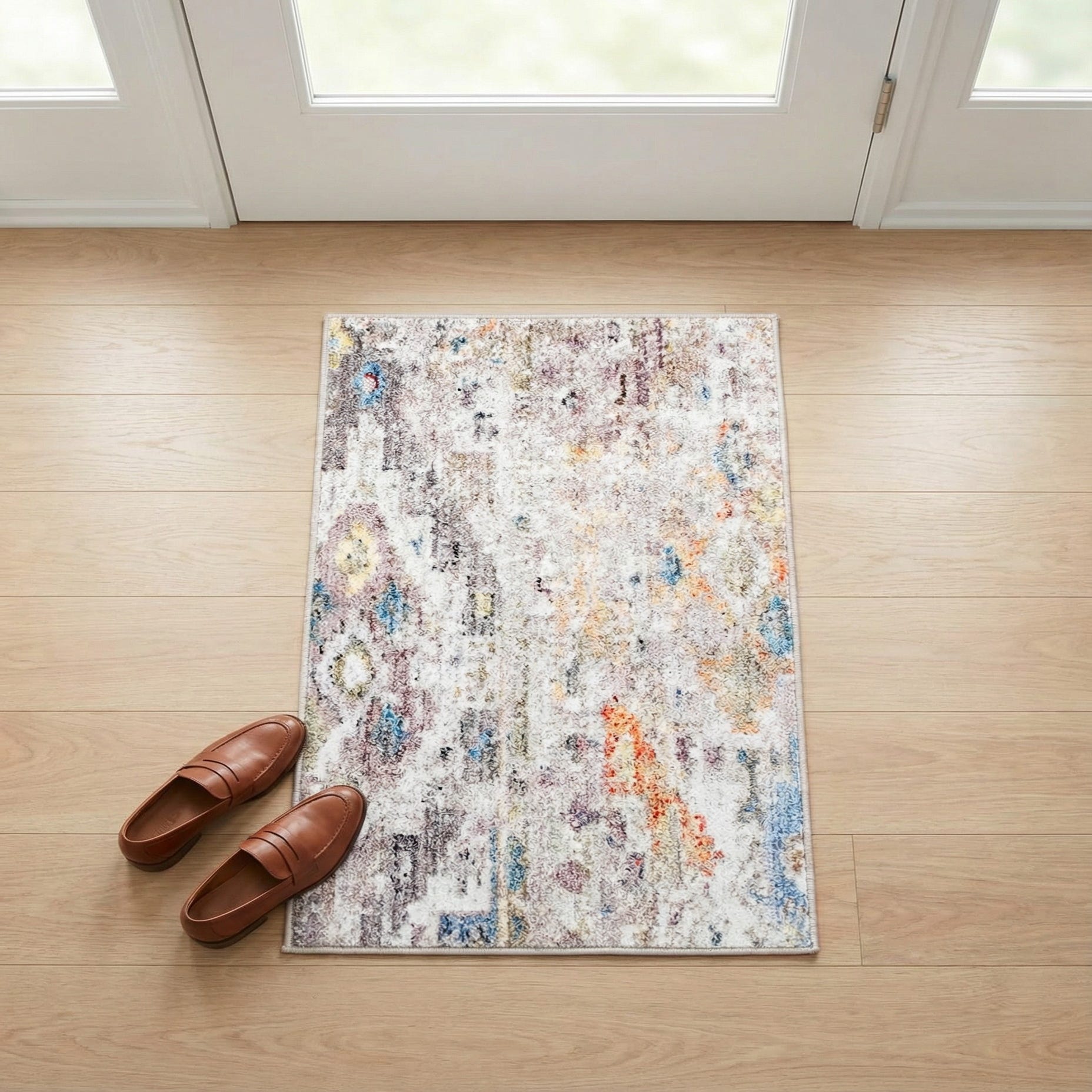 Primary color is Cream. Colors in this rug include: Cream, Blue, Light Blue, Light Brown, Orange, Yellow.