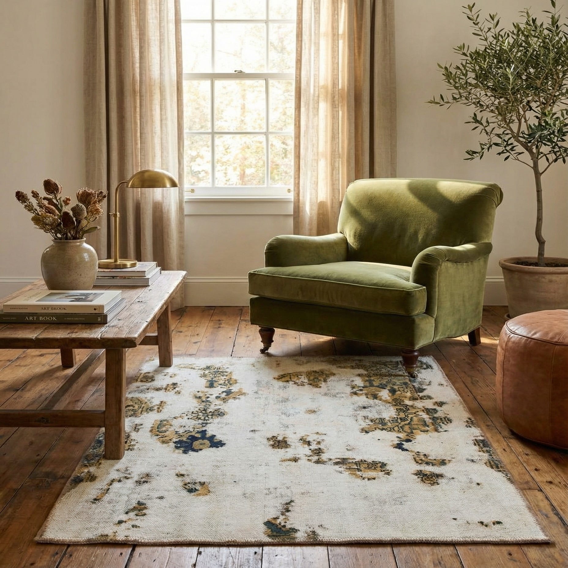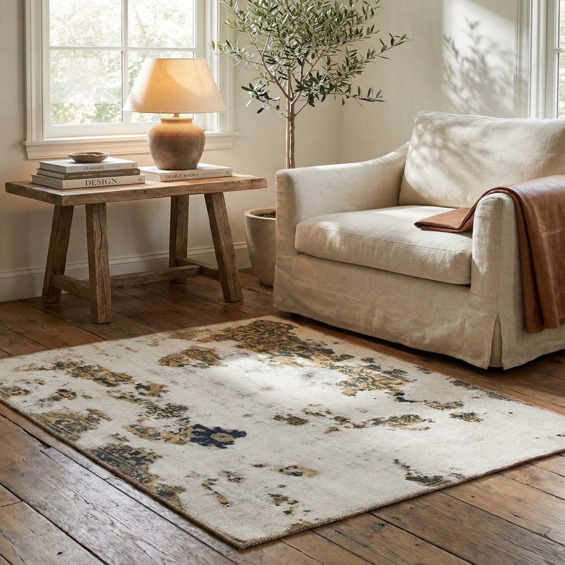 Primary color is Cream. Colors in this rug include: Cream, Brown, Tan, Navy Blue.