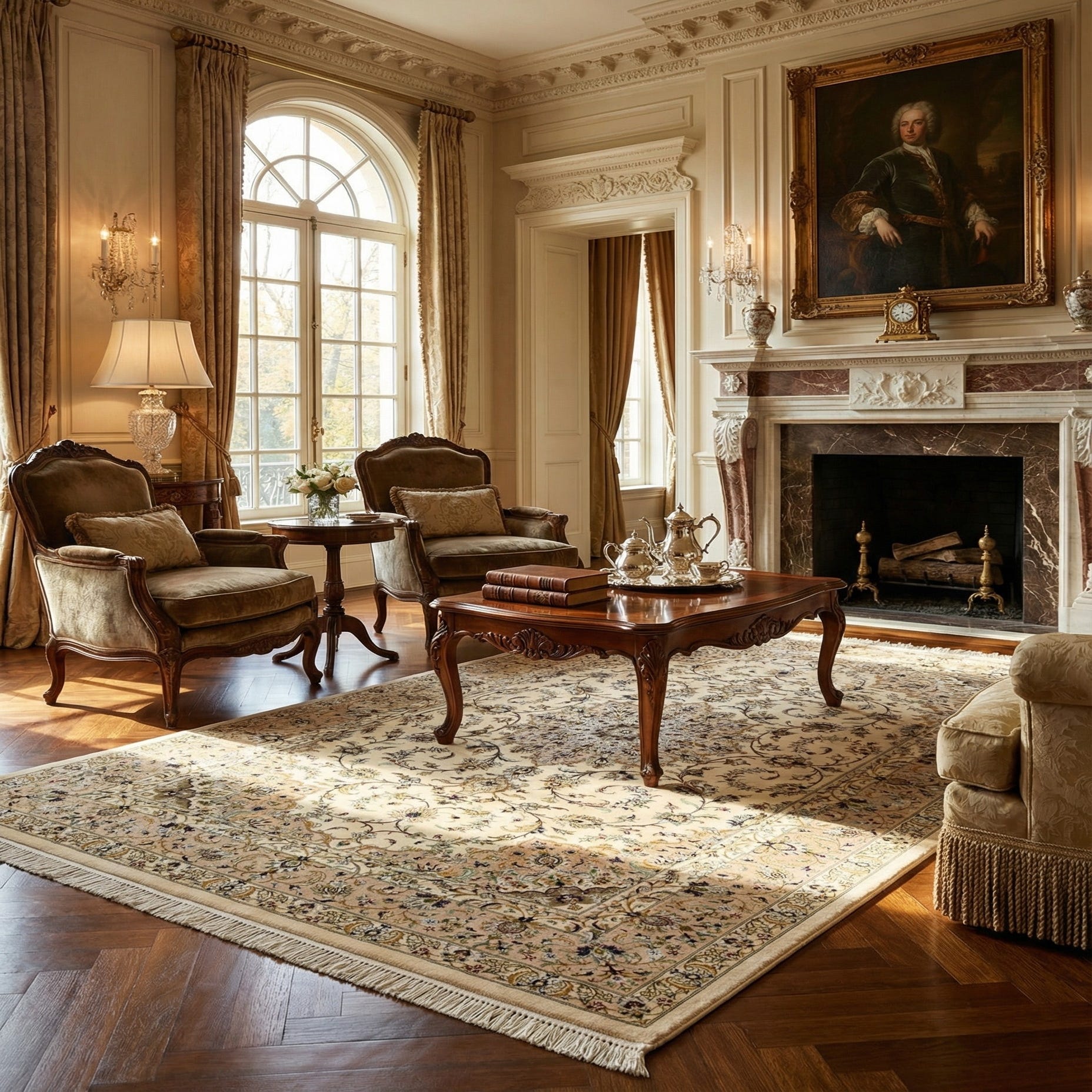 Primary color is Cream. Colors in this rug include: Cream, Cream, Light Brown, Light Blue, Dark Blue, Green, Orange.