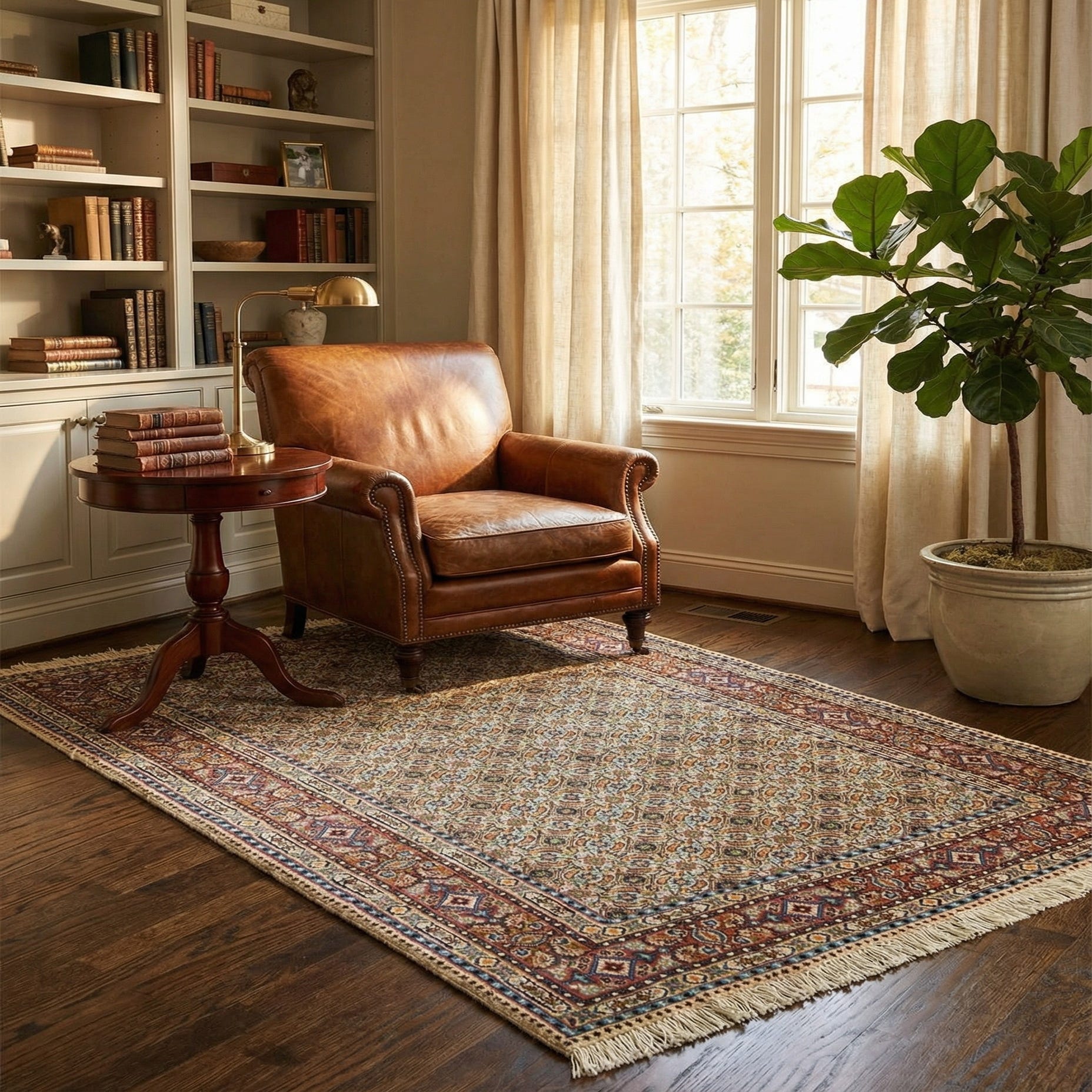 Primary color is Cream. Colors in this rug include: Cream, Cream, Brown, Green, Light Blue, Dark blue.