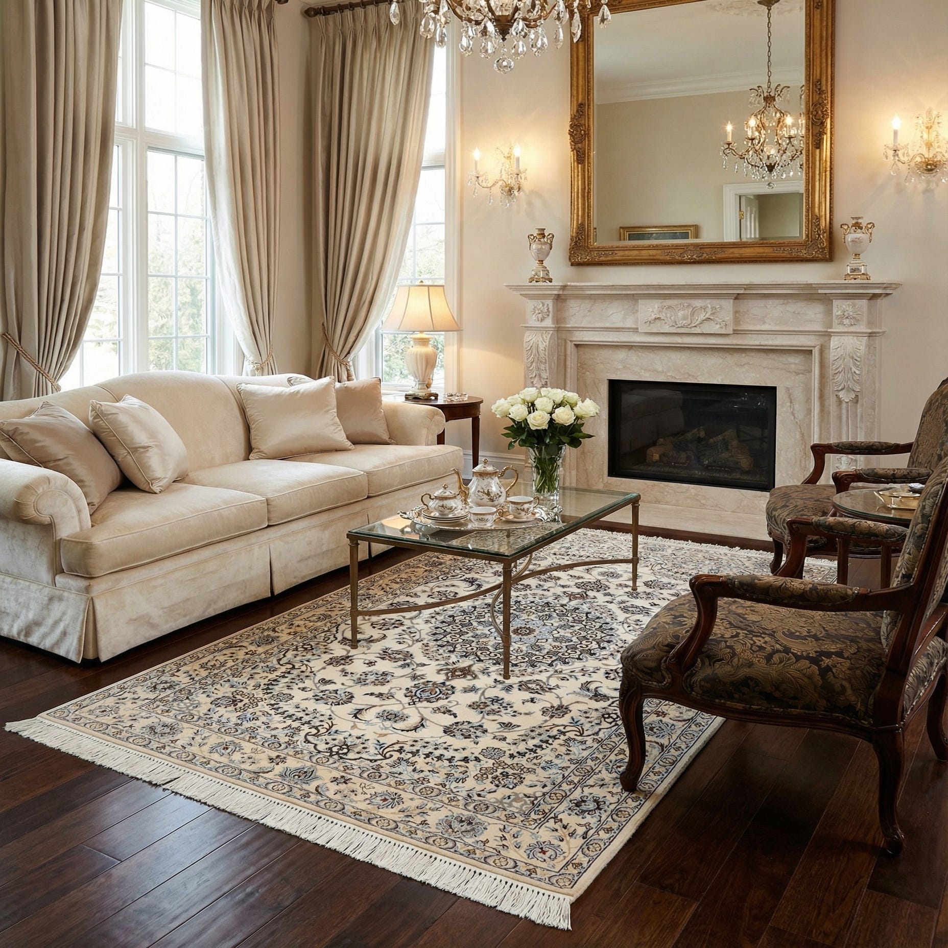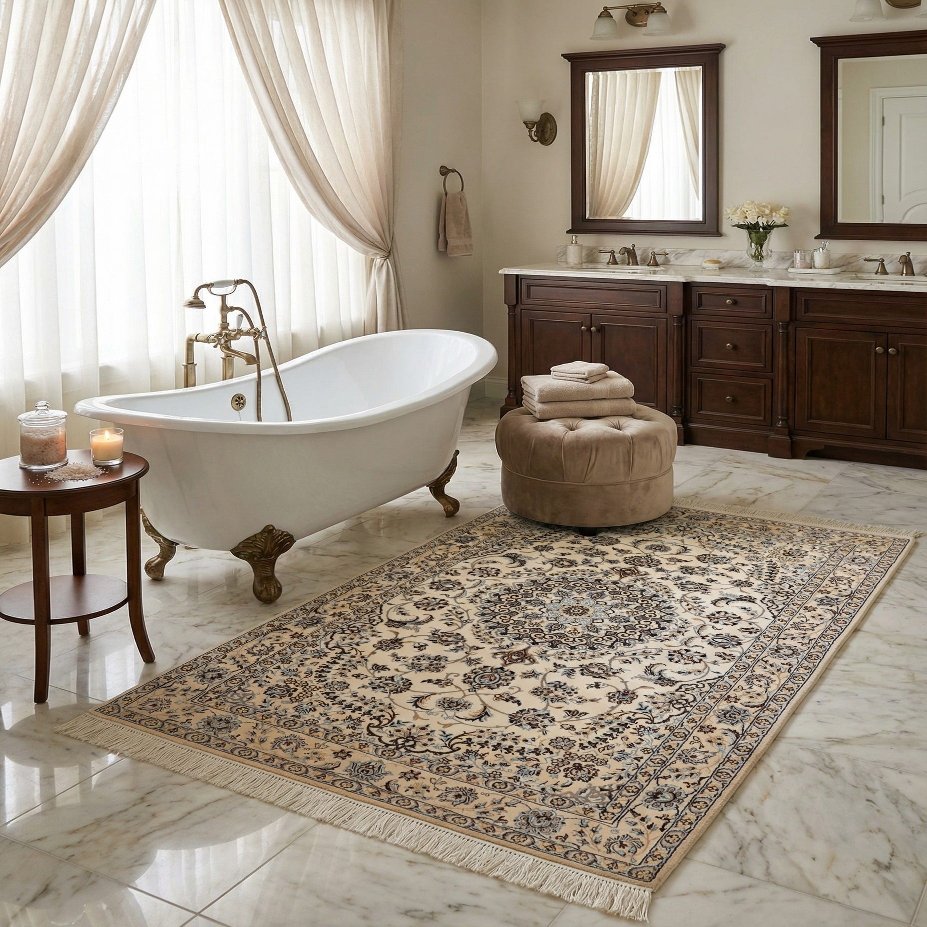 Primary color is Cream. Colors in this rug include: Cream, Cream, Brown, Dark Blue, Blue, Beige.