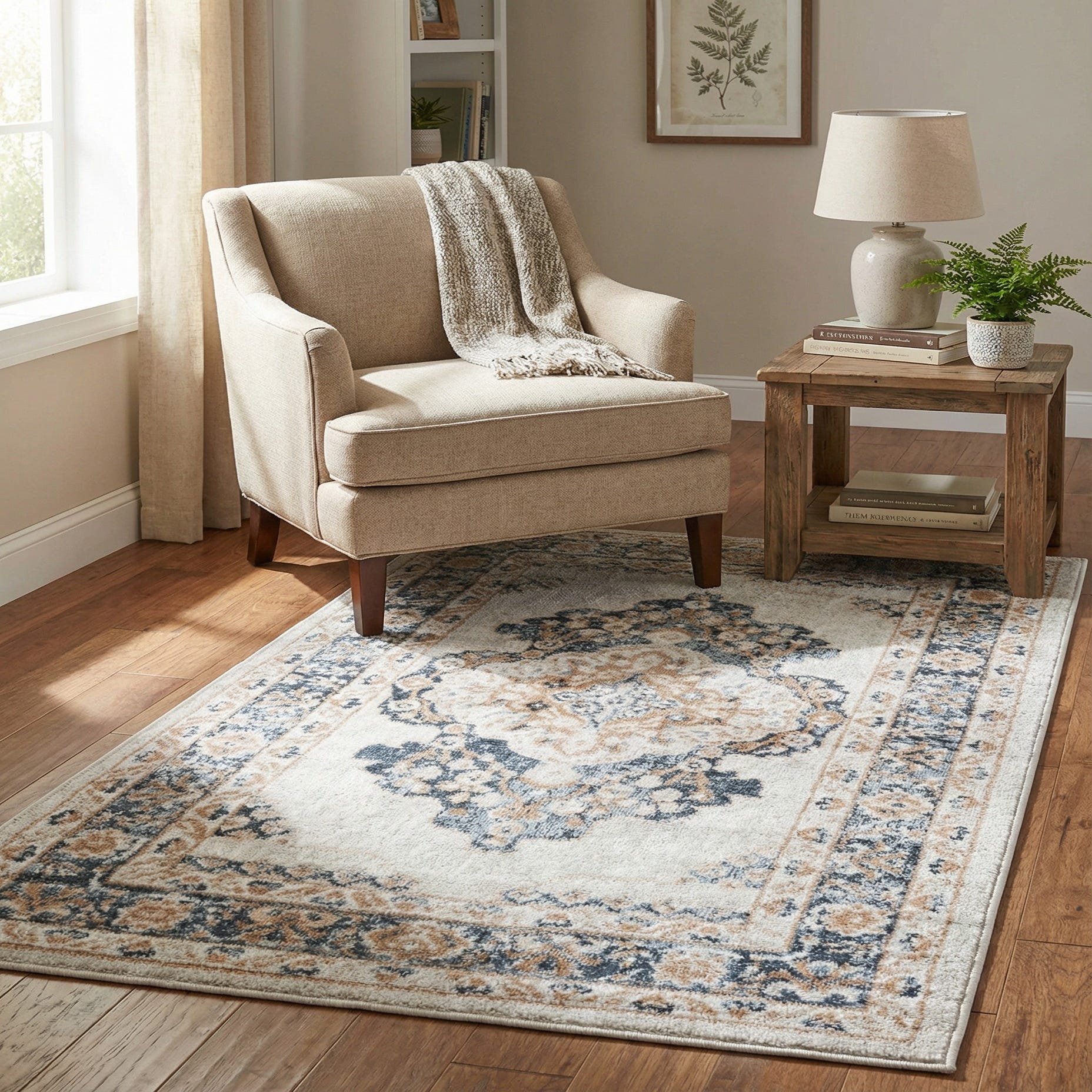 Primary color is Cream. Colors in this rug include: Cream, Beige, Blue, Ivory, Gray.