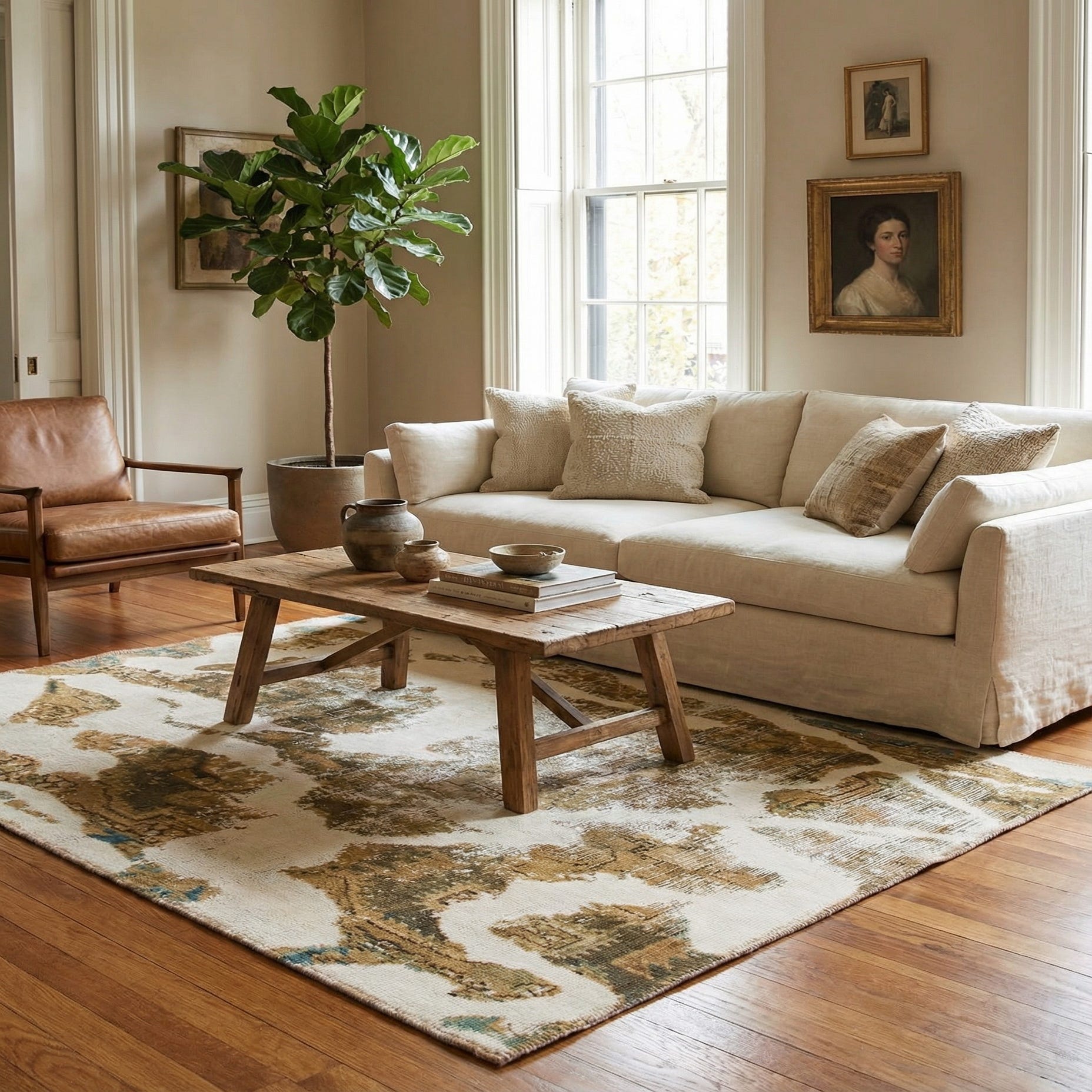 Primary color is Cream. Colors in this rug include: Cream, Beige, Brown, Light Brown, Tan, Green.