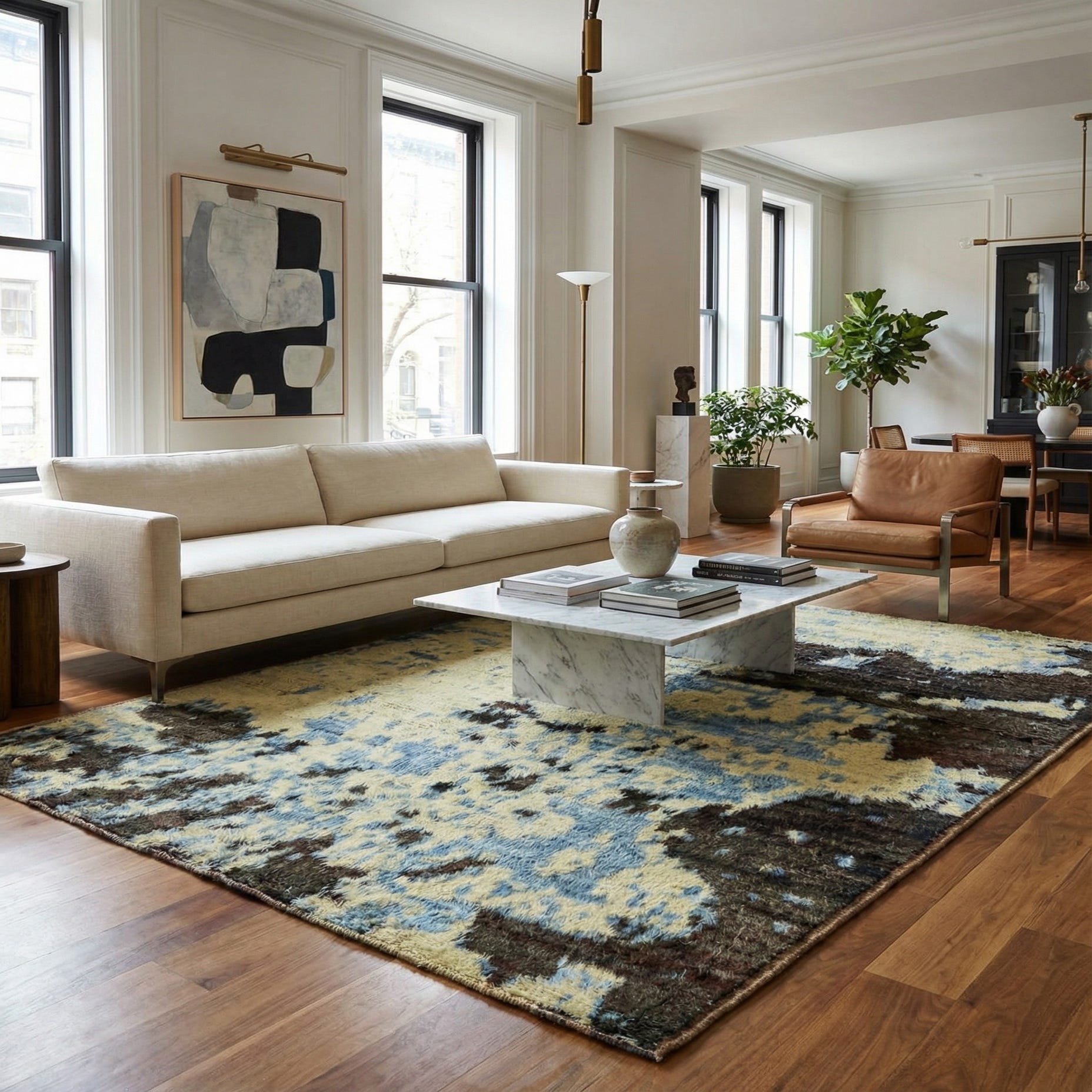 Primary color is Cream. Colors in this rug include: Cream, Blue, Brown.
