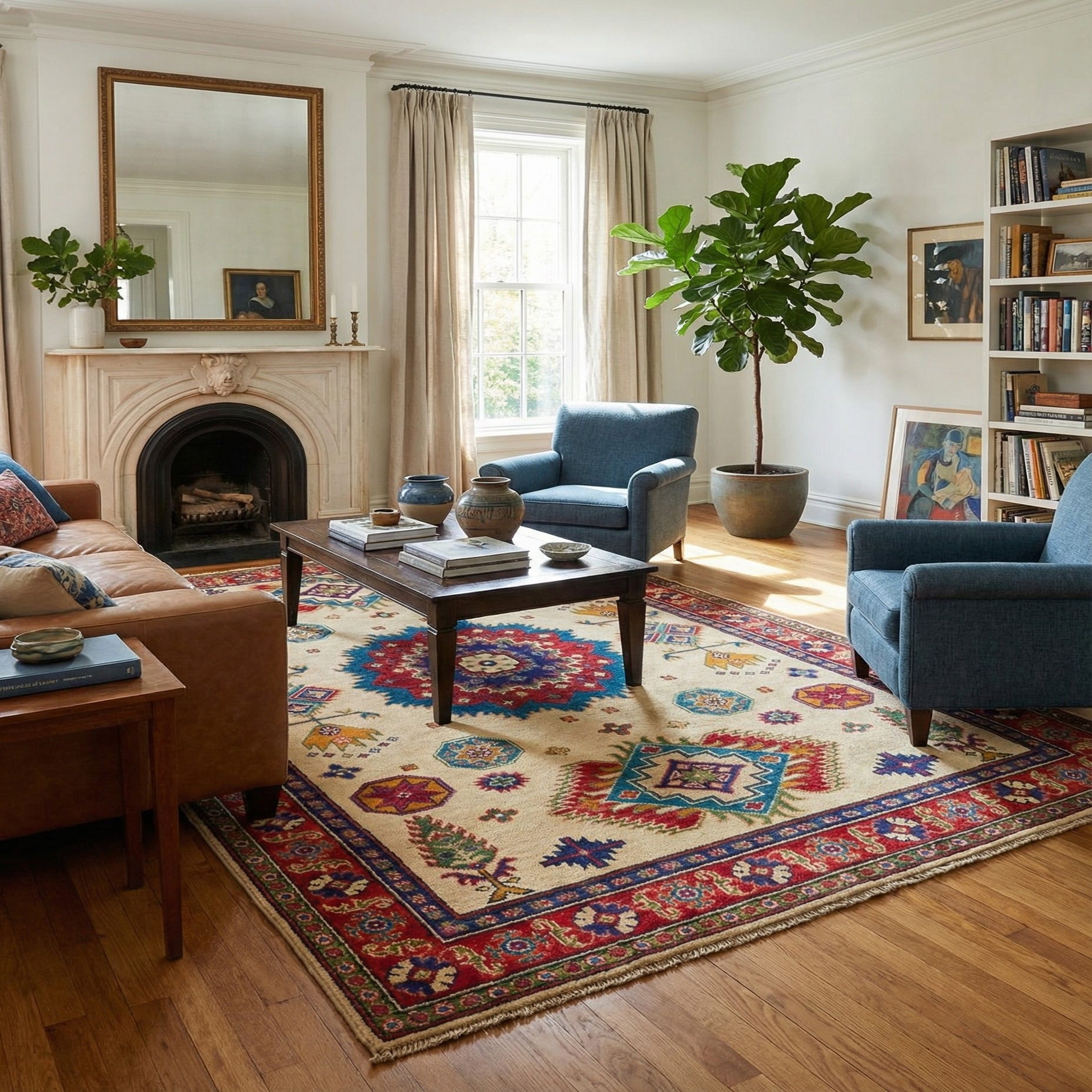 Primary color is Cream. Colors in this rug include: Cream, Blue, Brown, Red, Green, Yellow, Navy Blue.