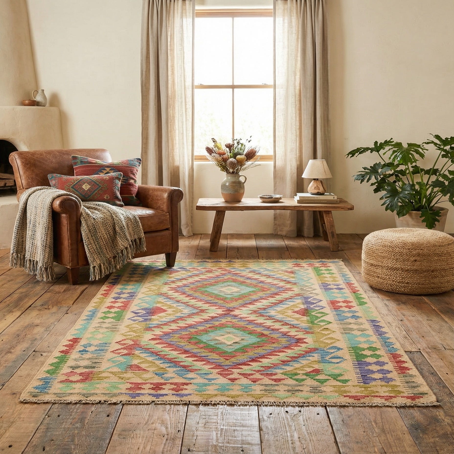 4' x 5' 8 Hand Woven Kilim Maymana Wool Rug