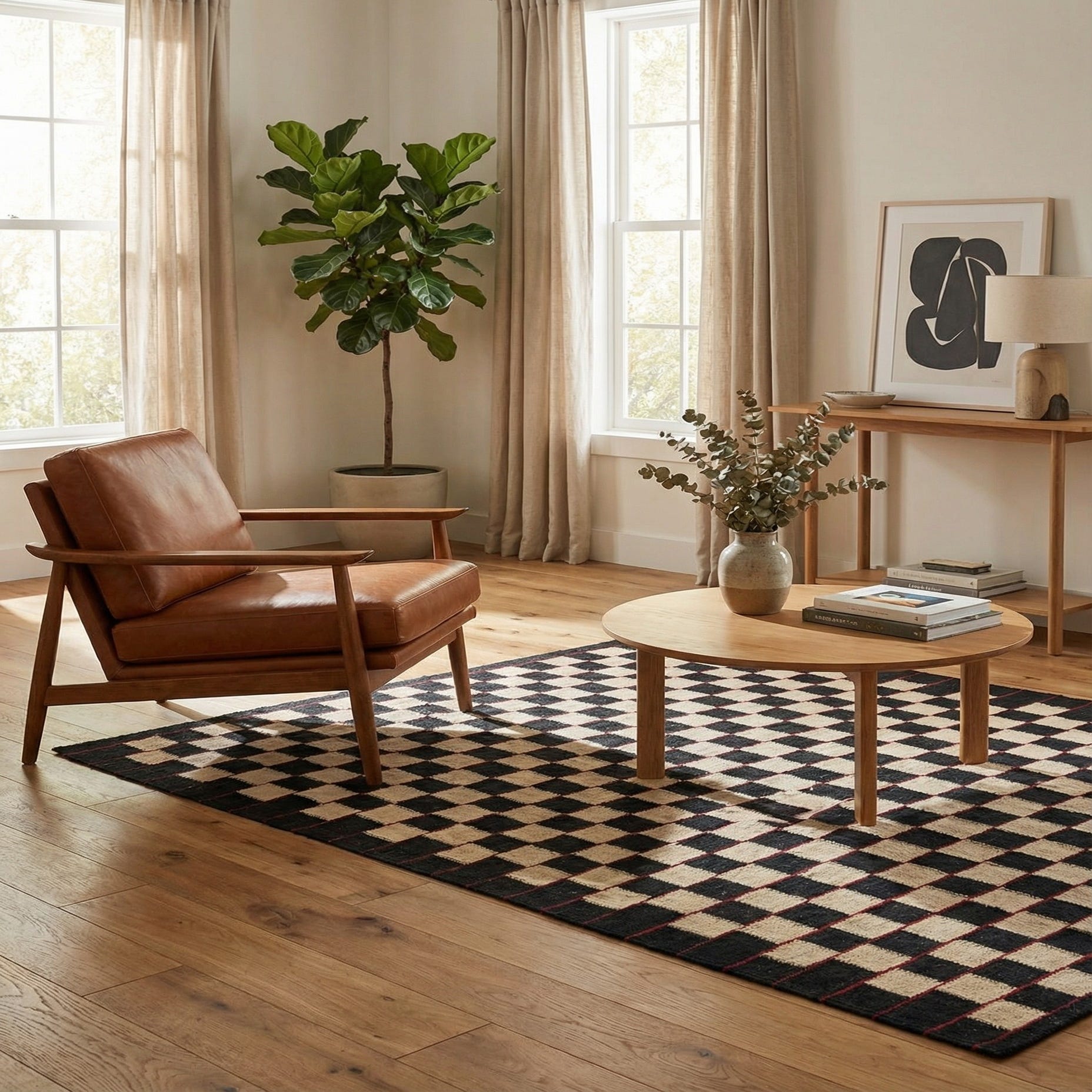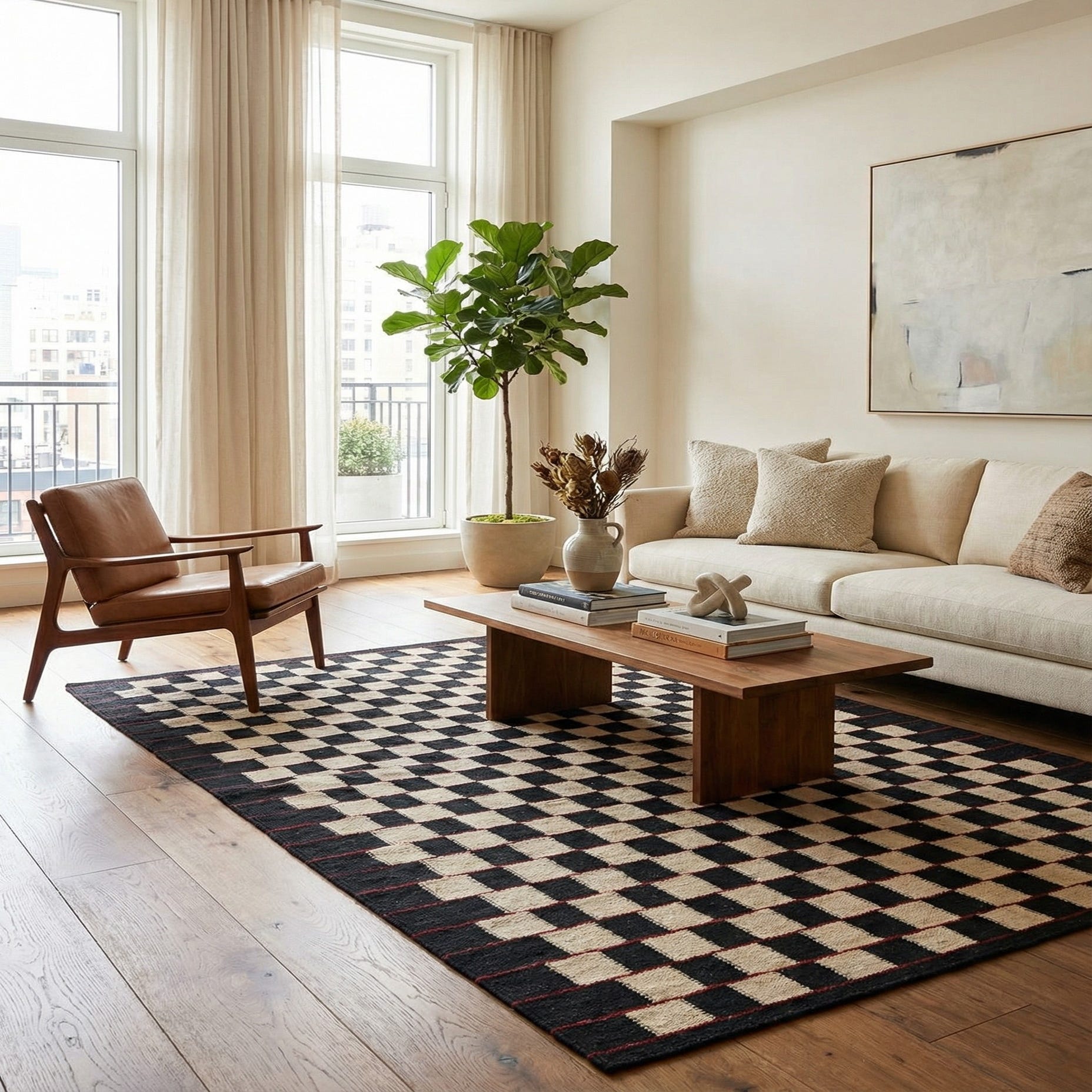 Primary color is Cream. Colors in this rug include: Cream, Black, Red.