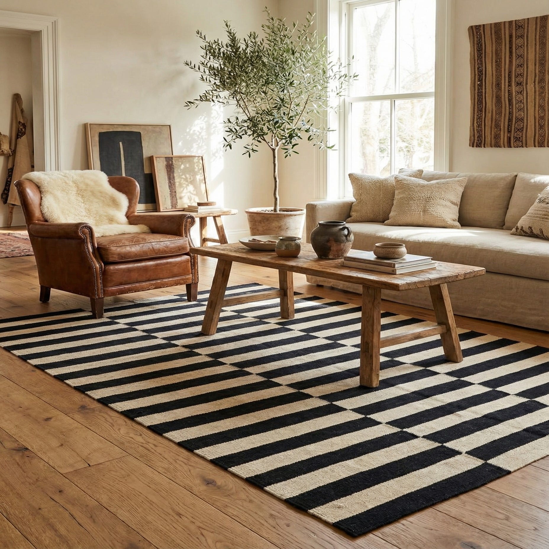 Primary color is Cream. Colors in this rug include: Cream, Black.