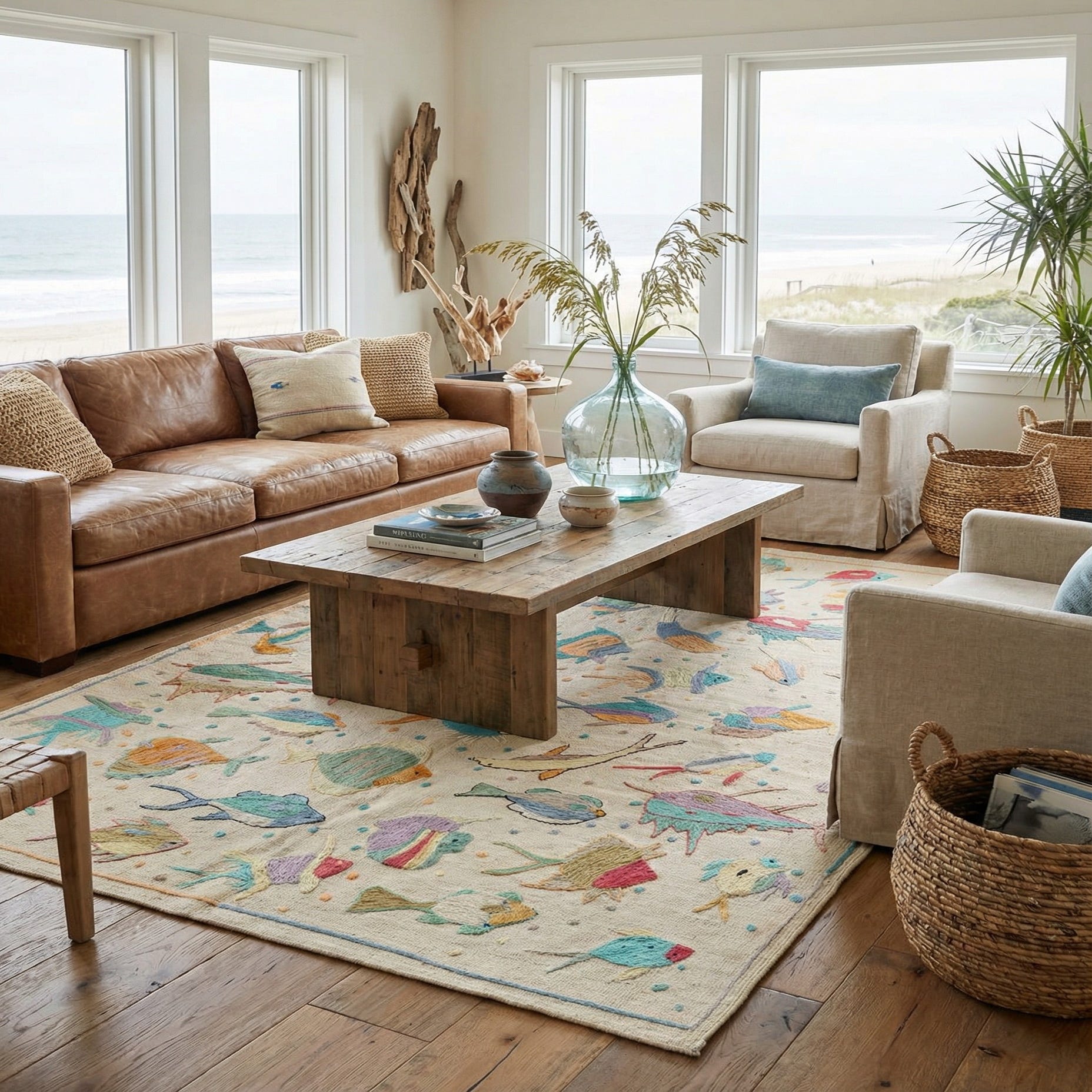 Primary color is Cream. Colors in this rug include: Cream, Blue, Brown, Olive, Orange, Red, Gray, Green, Black, Ivory.