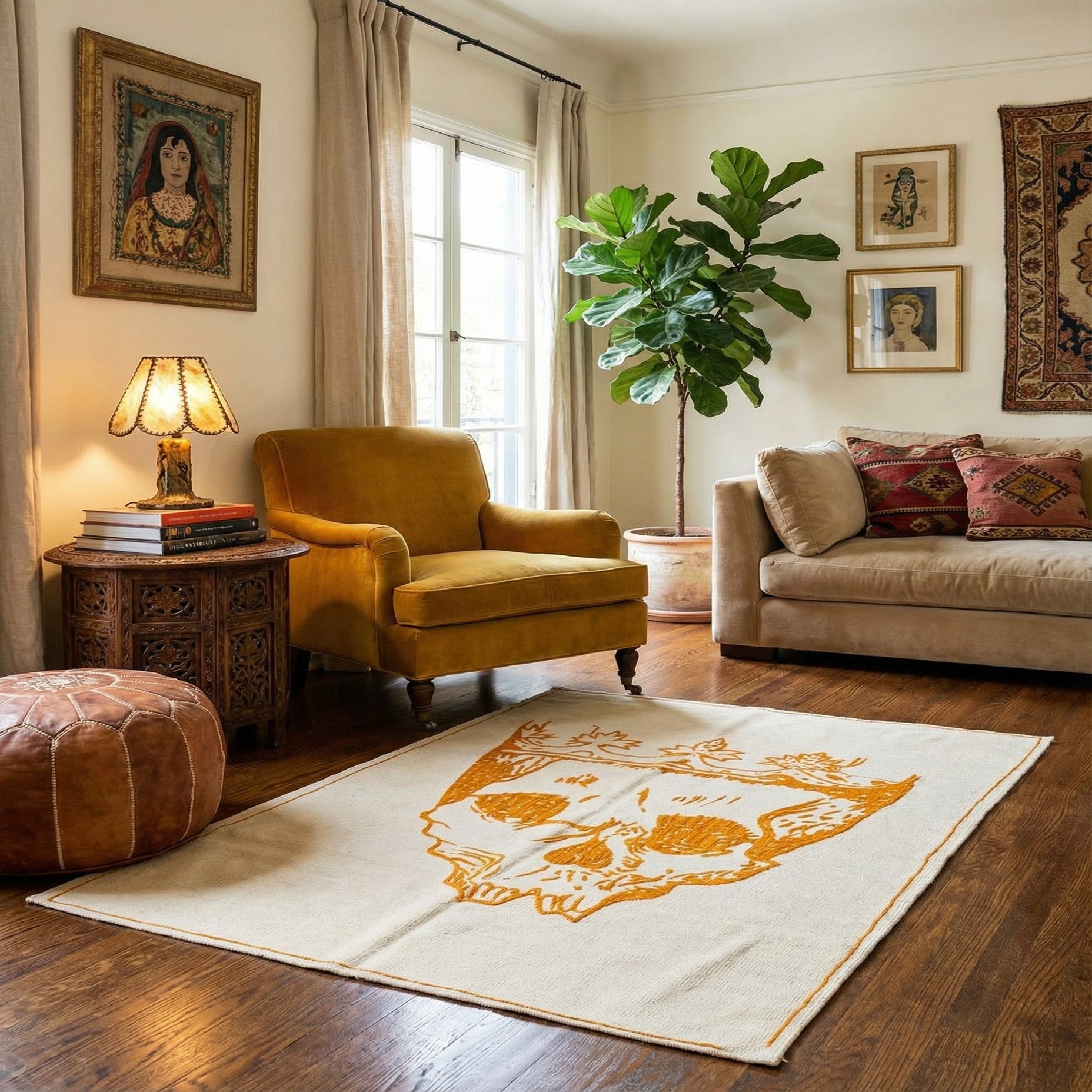 Primary color is Cream. Colors in this rug include: Cream, Orange.
