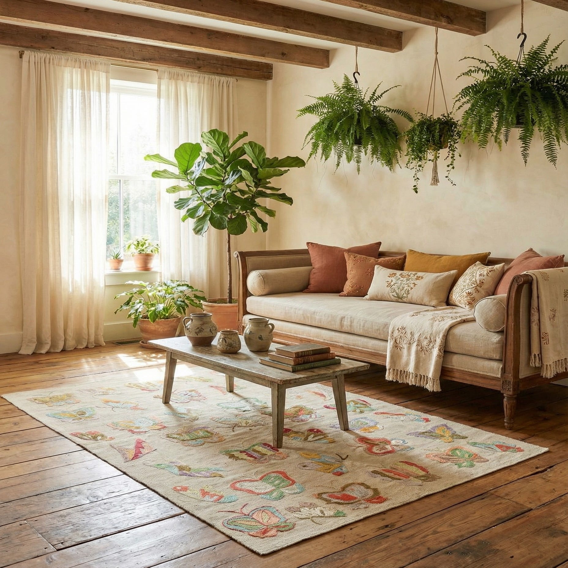 Primary color is Cream. Colors in this rug include: Cream, Brown, Gold, Ivory, Olive, Orange, Red, Light Green, Light Brown.