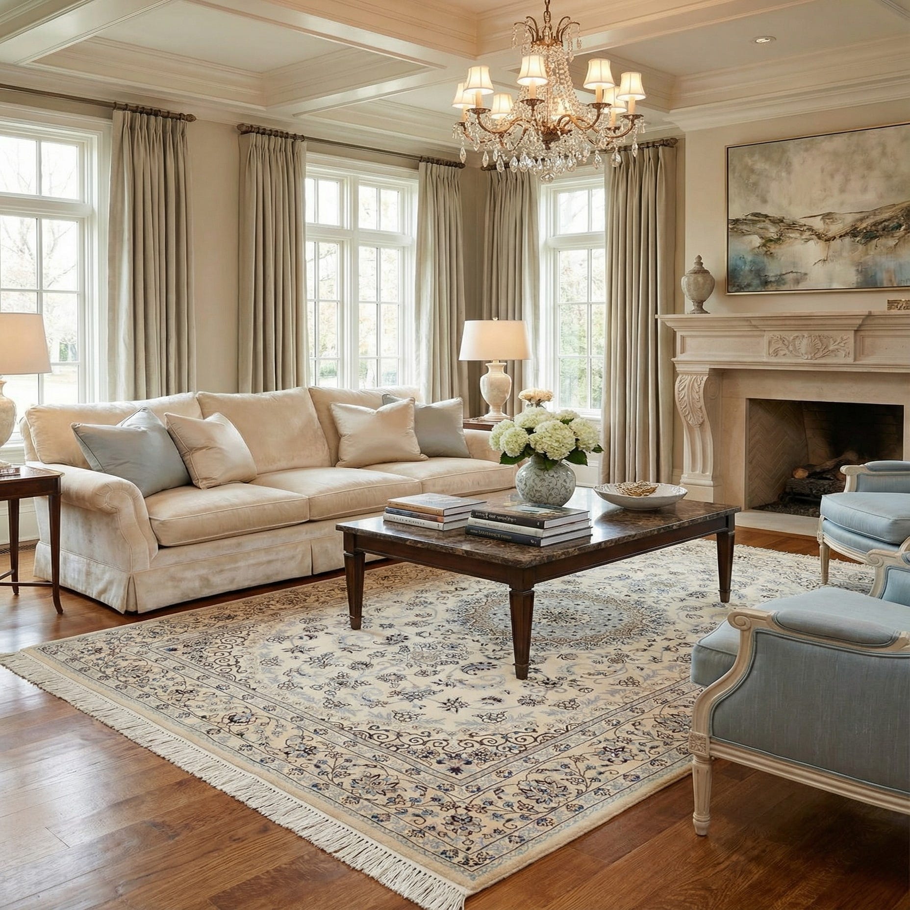 Primary color is Cream. Colors in this rug include: Cream, Cream, Brown, Dark Blue, Blue, Beige.
