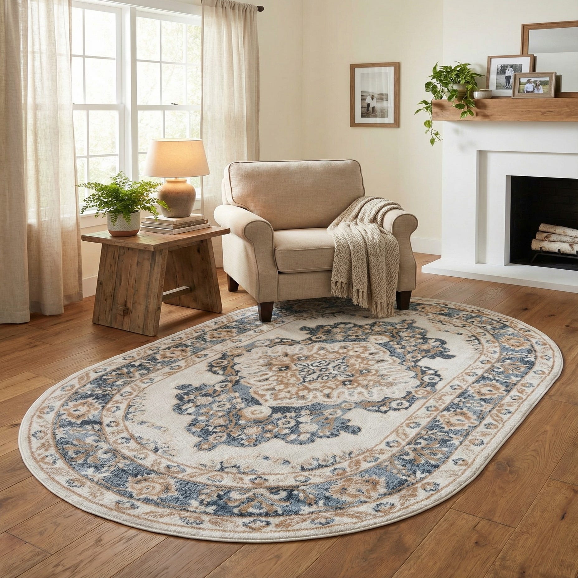 Primary color is Cream. Colors in this rug include: Cream, Blue, Brown, Gray, Ivory.