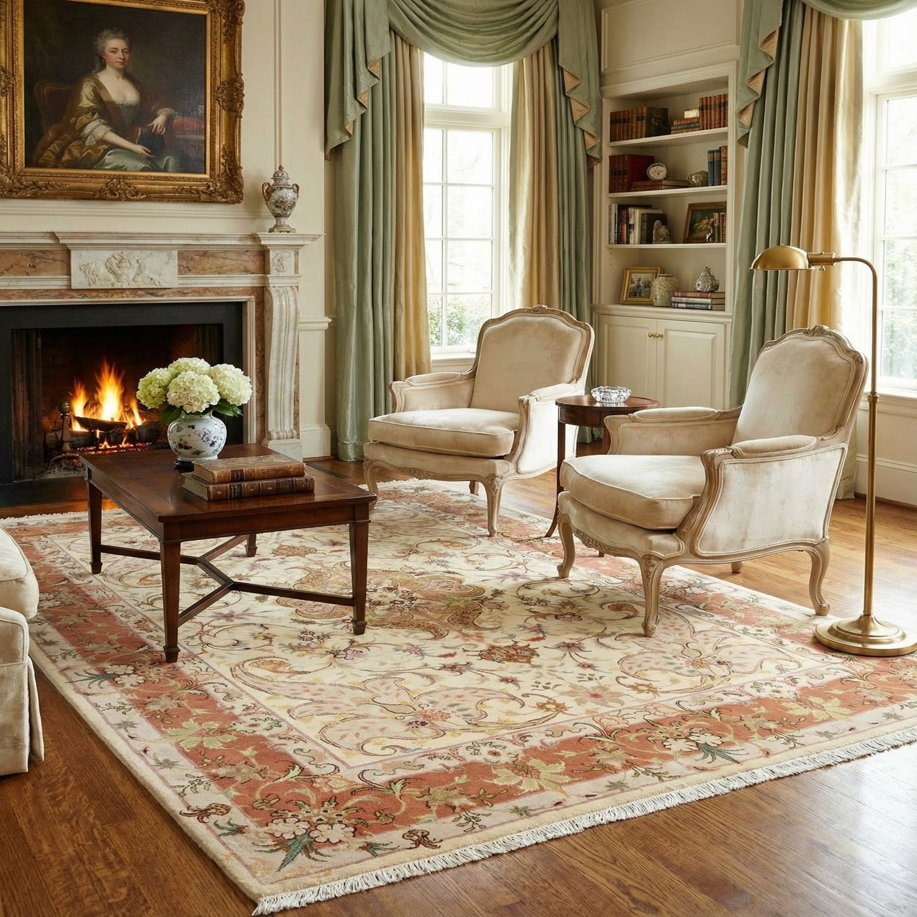 Primary color is Cream. Colors in this rug include: Cream, Cream, Orange, Purple, Pink, Blue, Yellow, Brown.