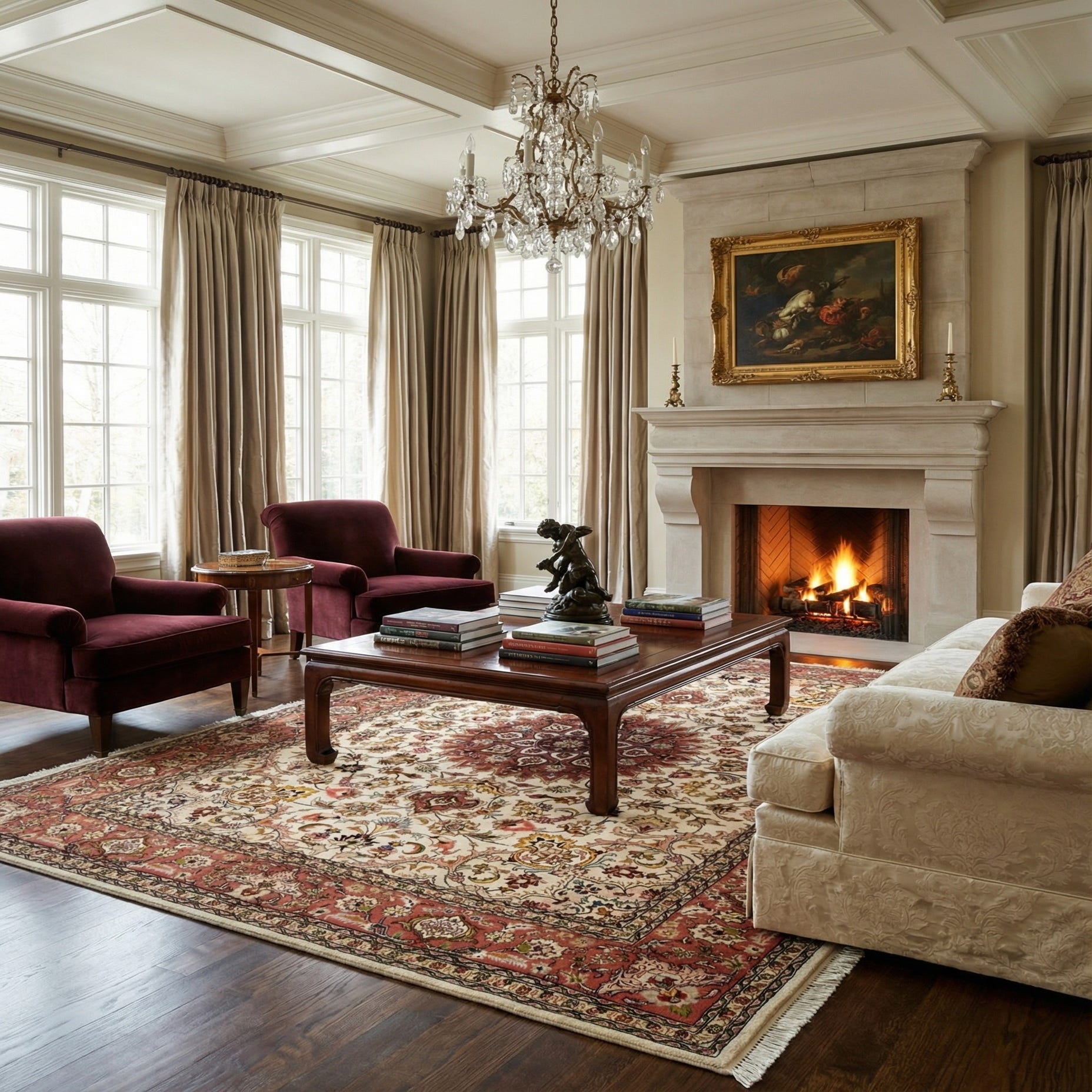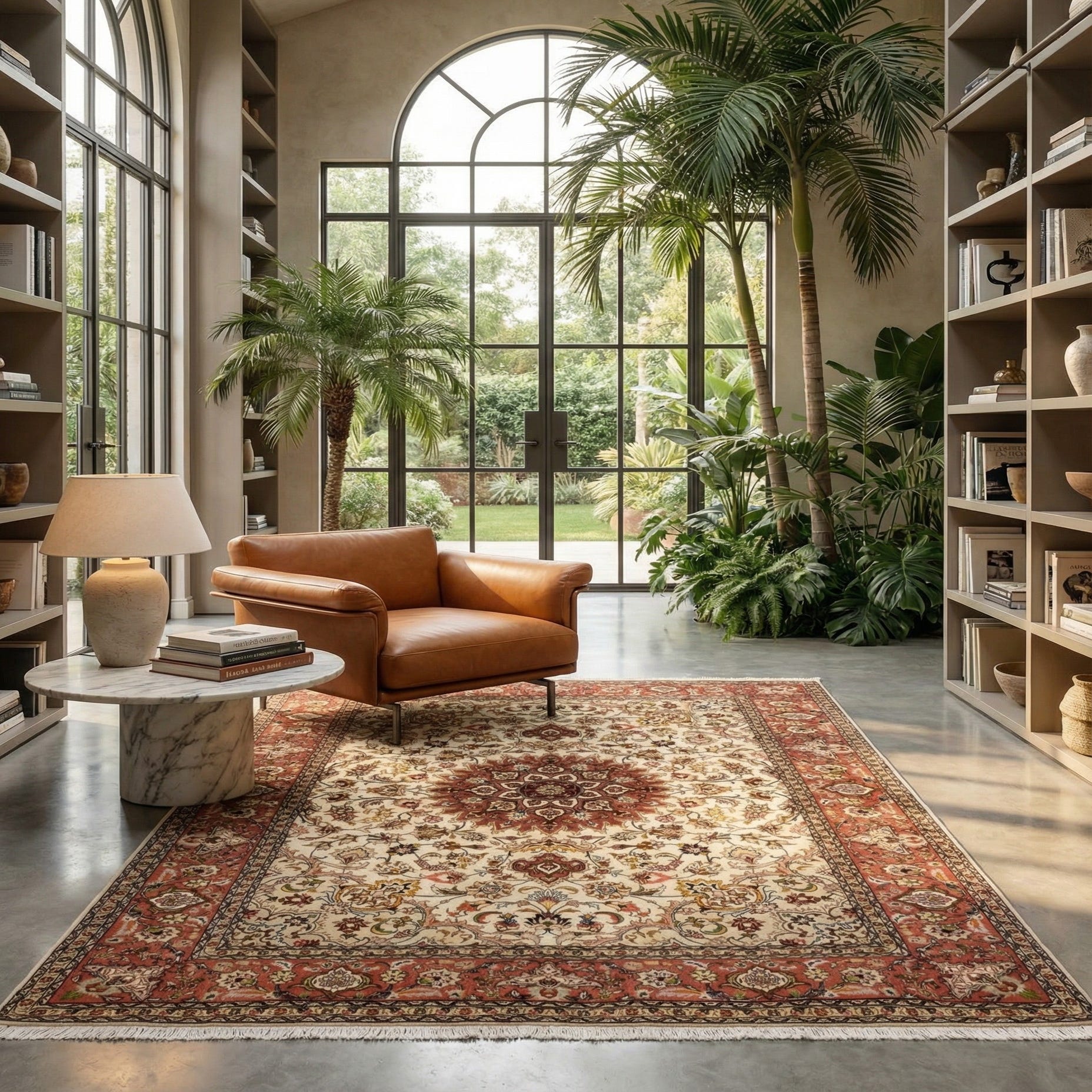 Primary color is Cream. Colors in this rug include: Cream, Cream, Pink, Black, Brown, Yellow, Olive, Red.