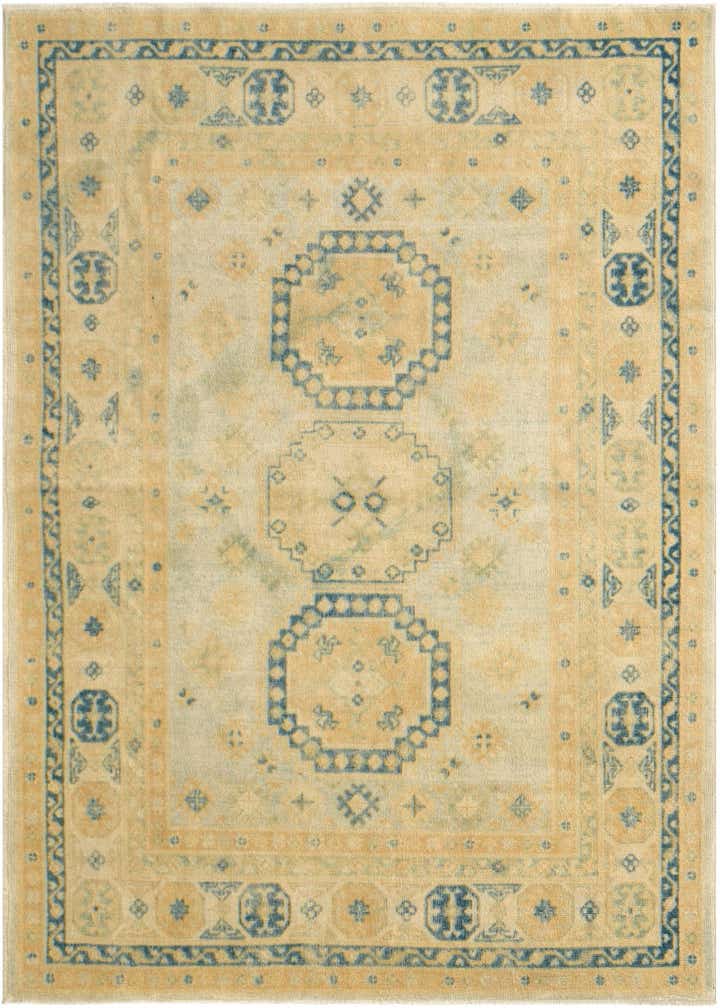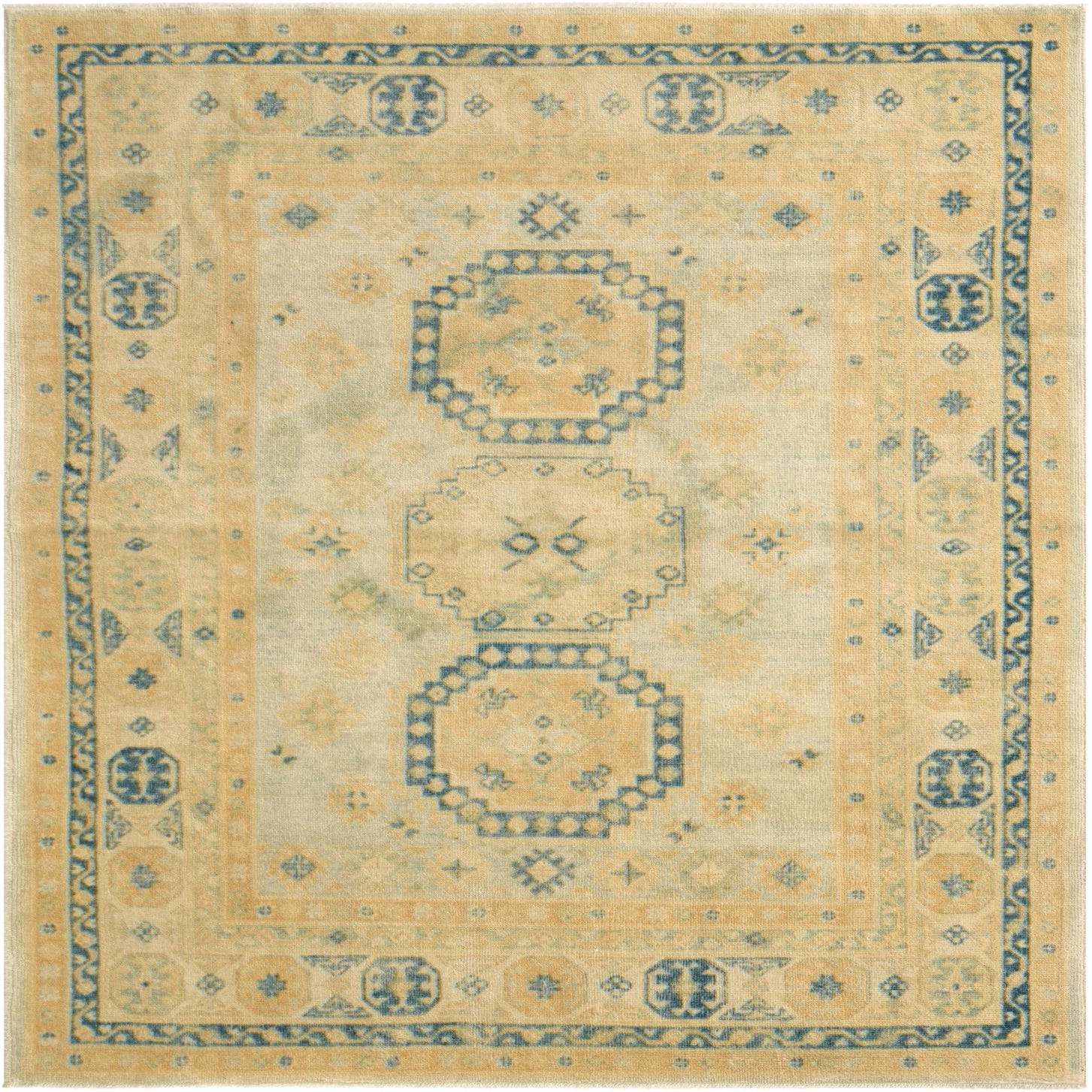 Primary color is Cream. Colors in this rug include: Cream, Blue, Tan, Ivory.