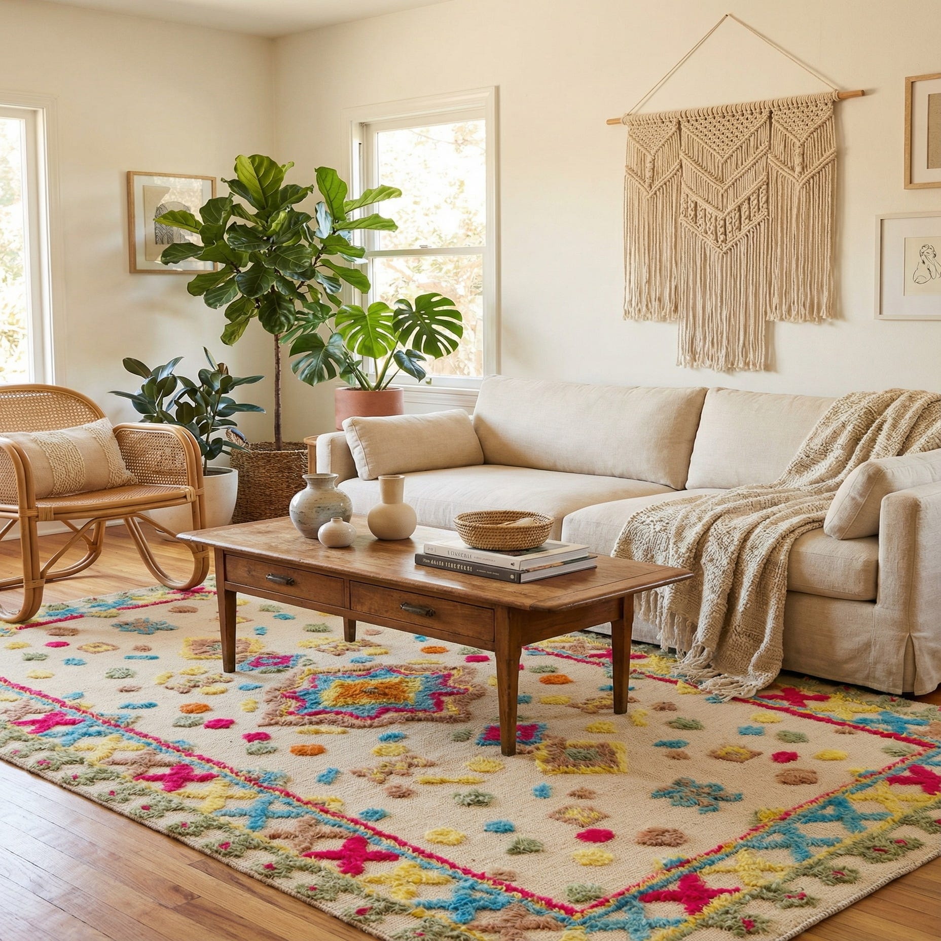 Primary color is Cream. Colors in this rug include: Cream, Blue, Red, Purple, Puce, Olive, Orange, Navy Blue, Natural NC.