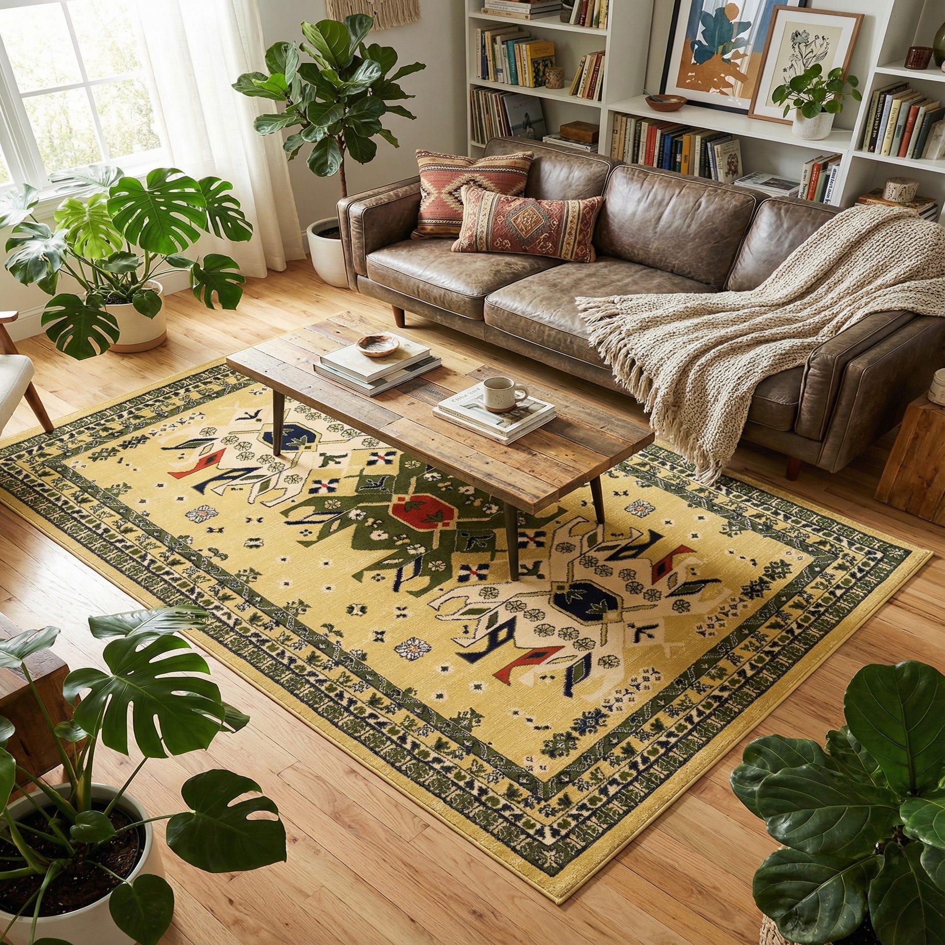 Primary color is Cream. Colors in this rug include: Cream, Black, Brown, Navy Blue, Terracotta, Yellow, Hunter Green.