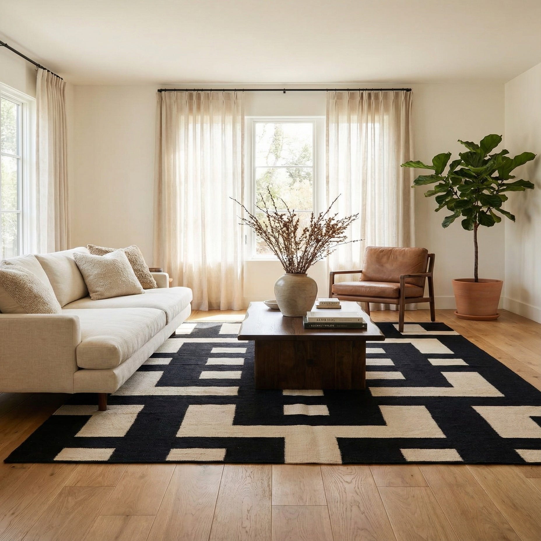 Primary color is Cream. Colors in this rug include: Cream, Black.
