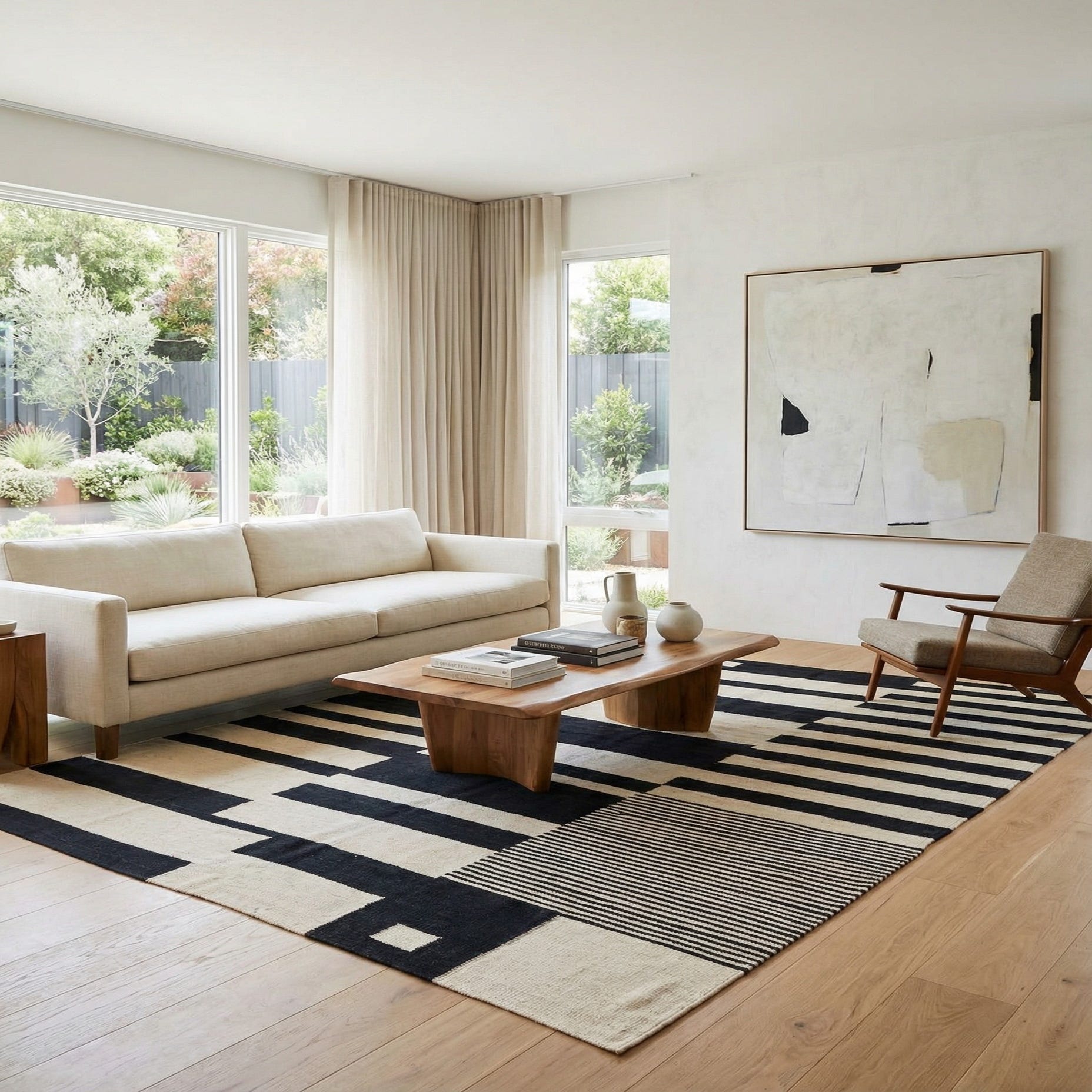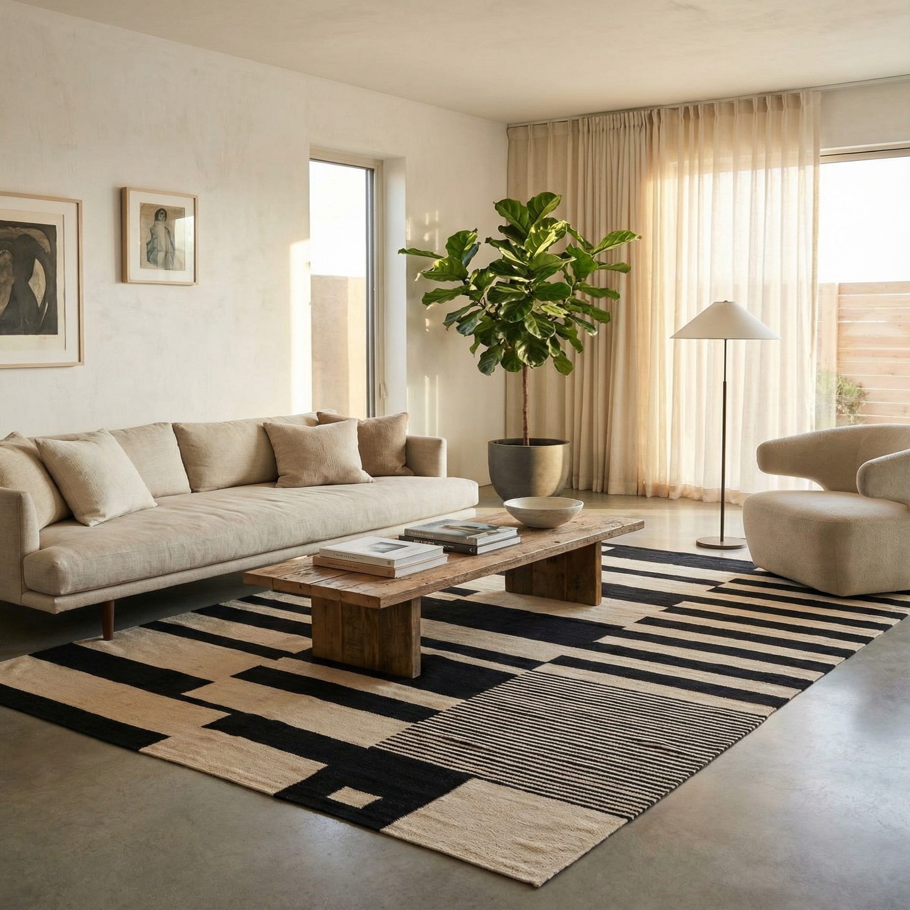 Primary color is Cream. Colors in this rug include: Cream, Black.