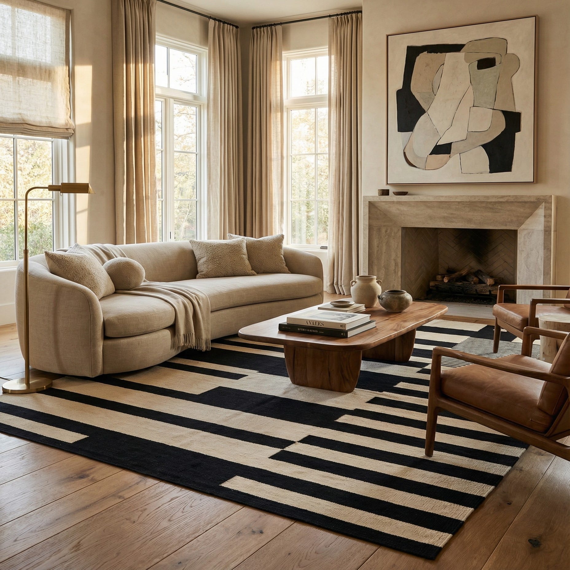 Primary color is Cream. Colors in this rug include: Cream, Black.