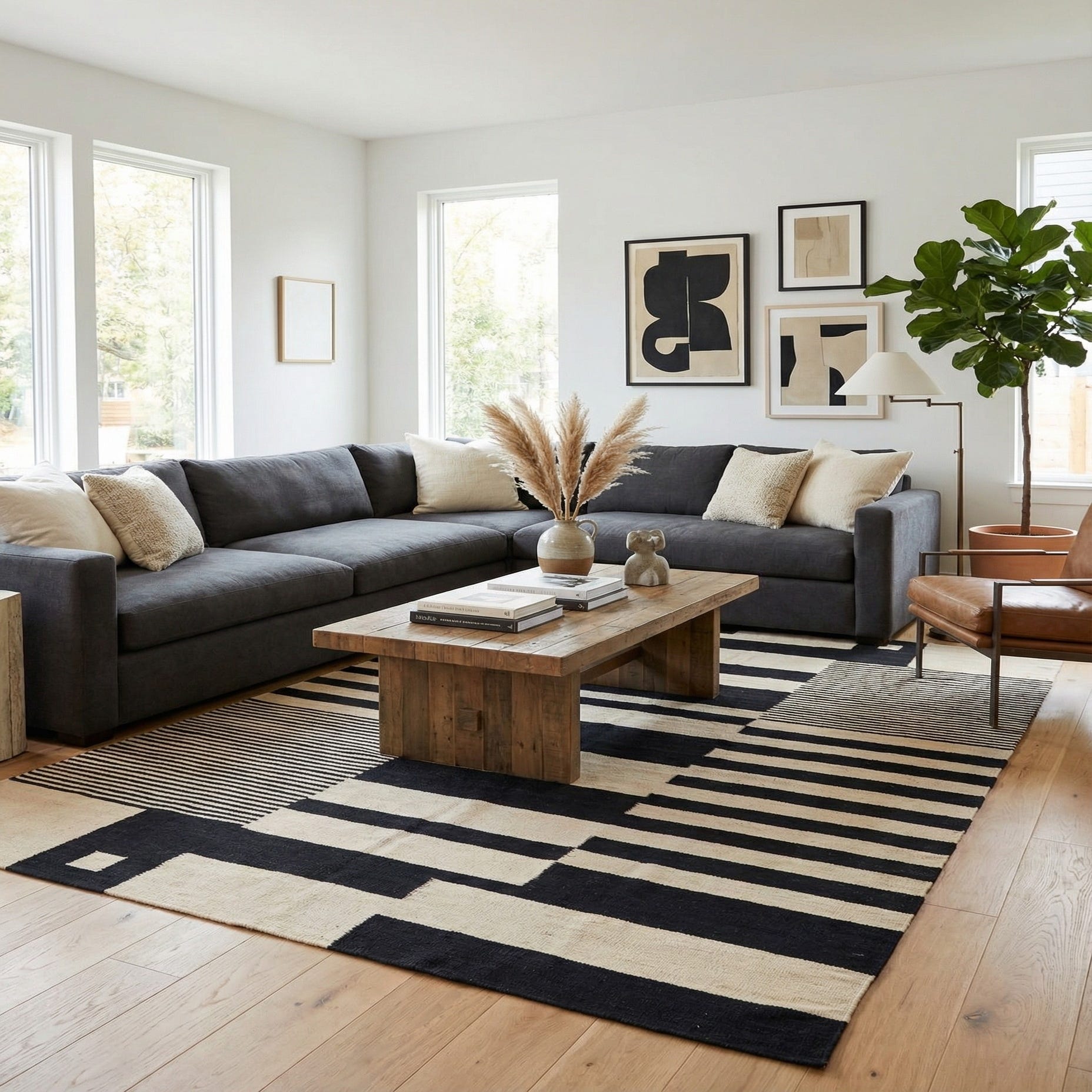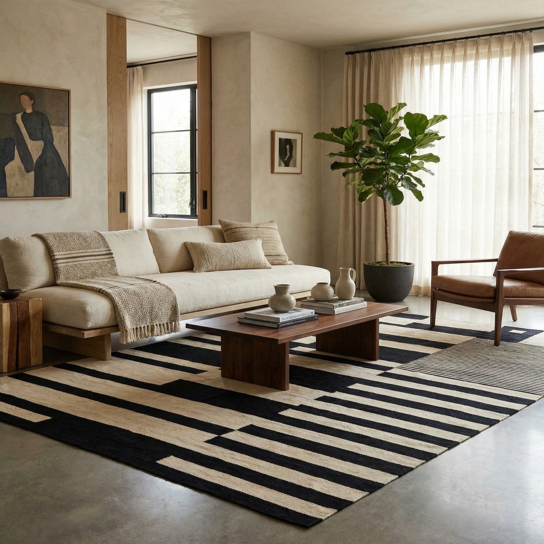 Primary color is Cream. Colors in this rug include: Cream, Black.