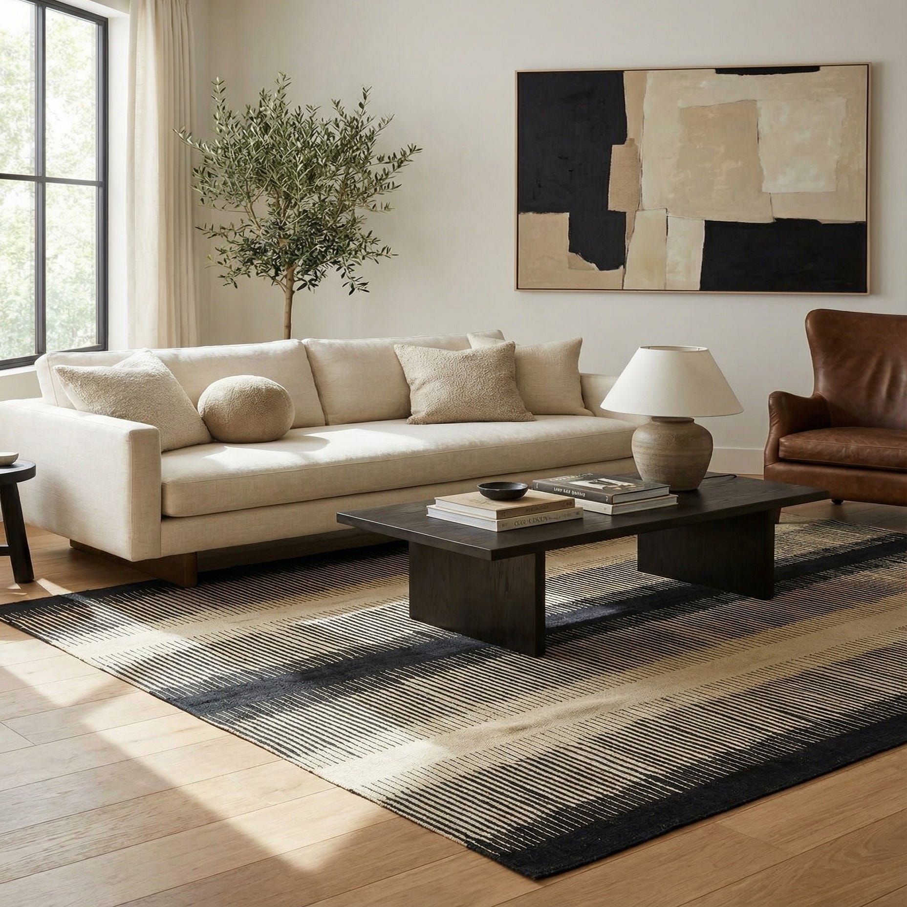 Primary color is Cream. Colors in this rug include: Cream, Black.