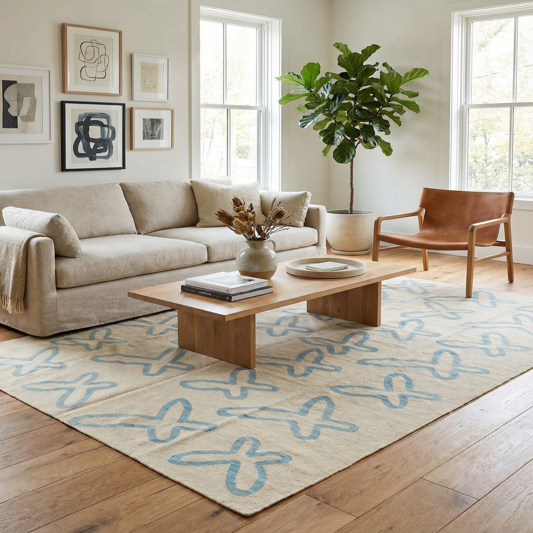 Primary color is Cream. Colors in this rug include: Cream, Light Blue.