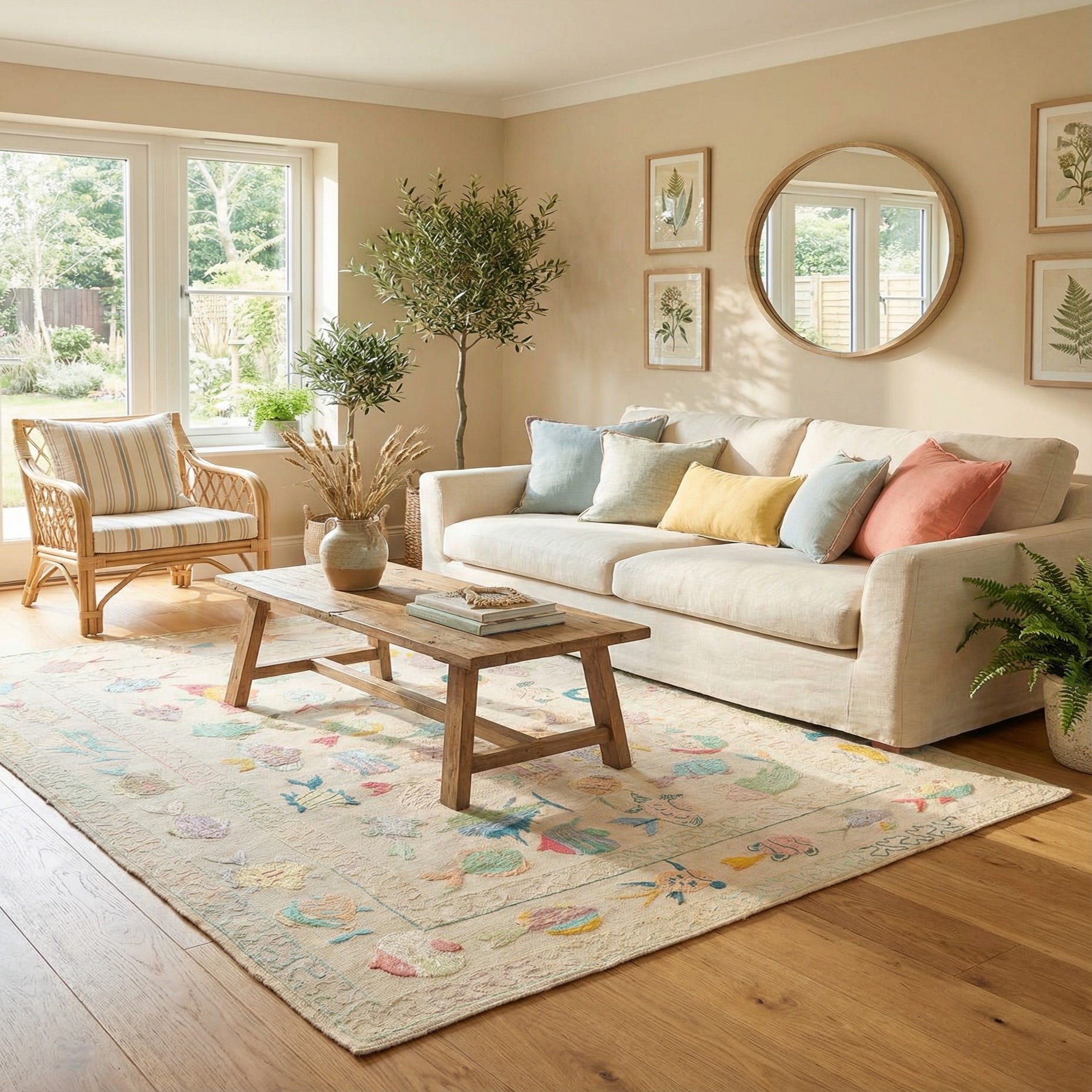 Primary color is Cream. Colors in this rug include: Cream, Beige, Brown, Light Blue, Gold, Green, Red, Yellow.