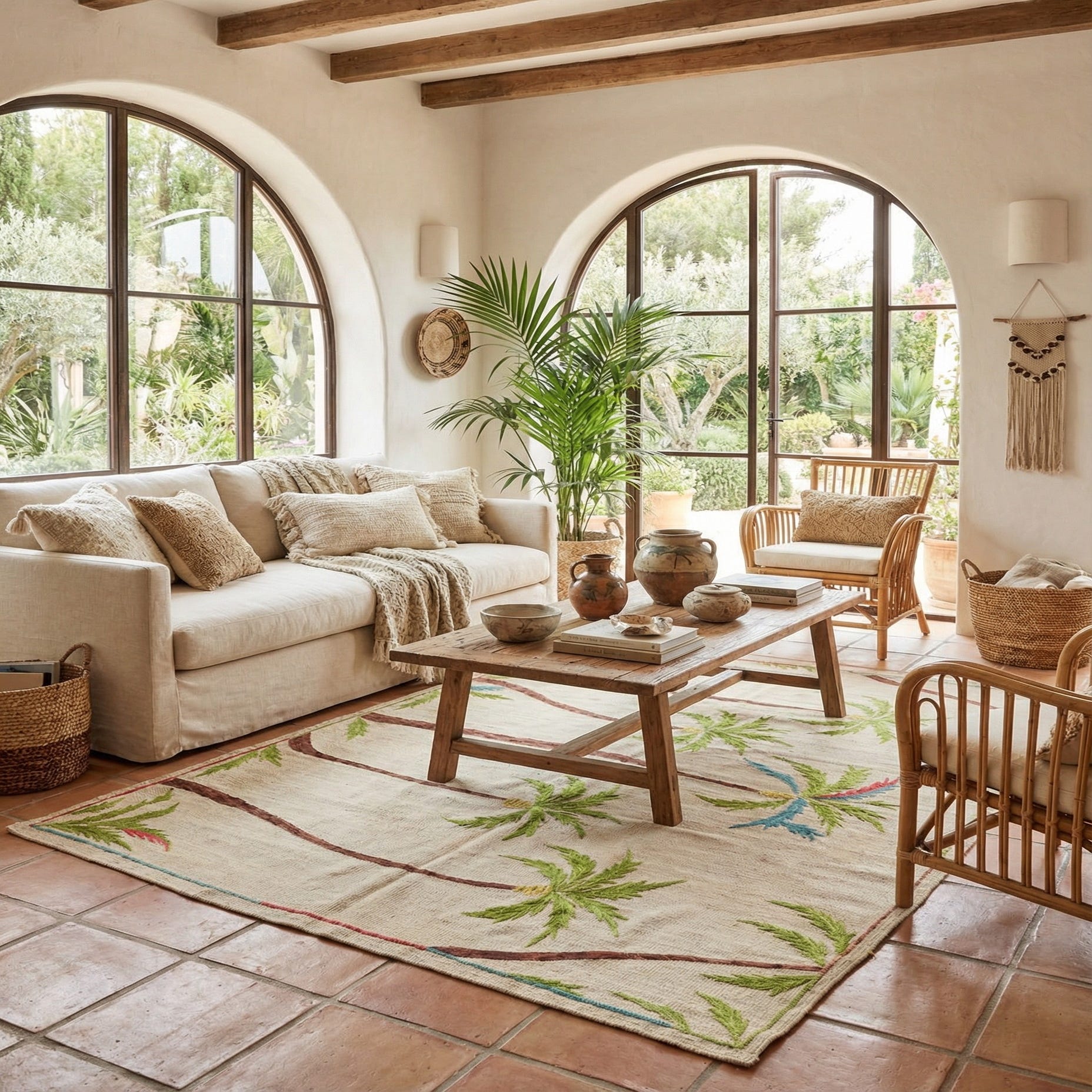 Primary color is Cream. Colors in this rug include: Cream, Brown, Green, Blue, Red, Yellow.